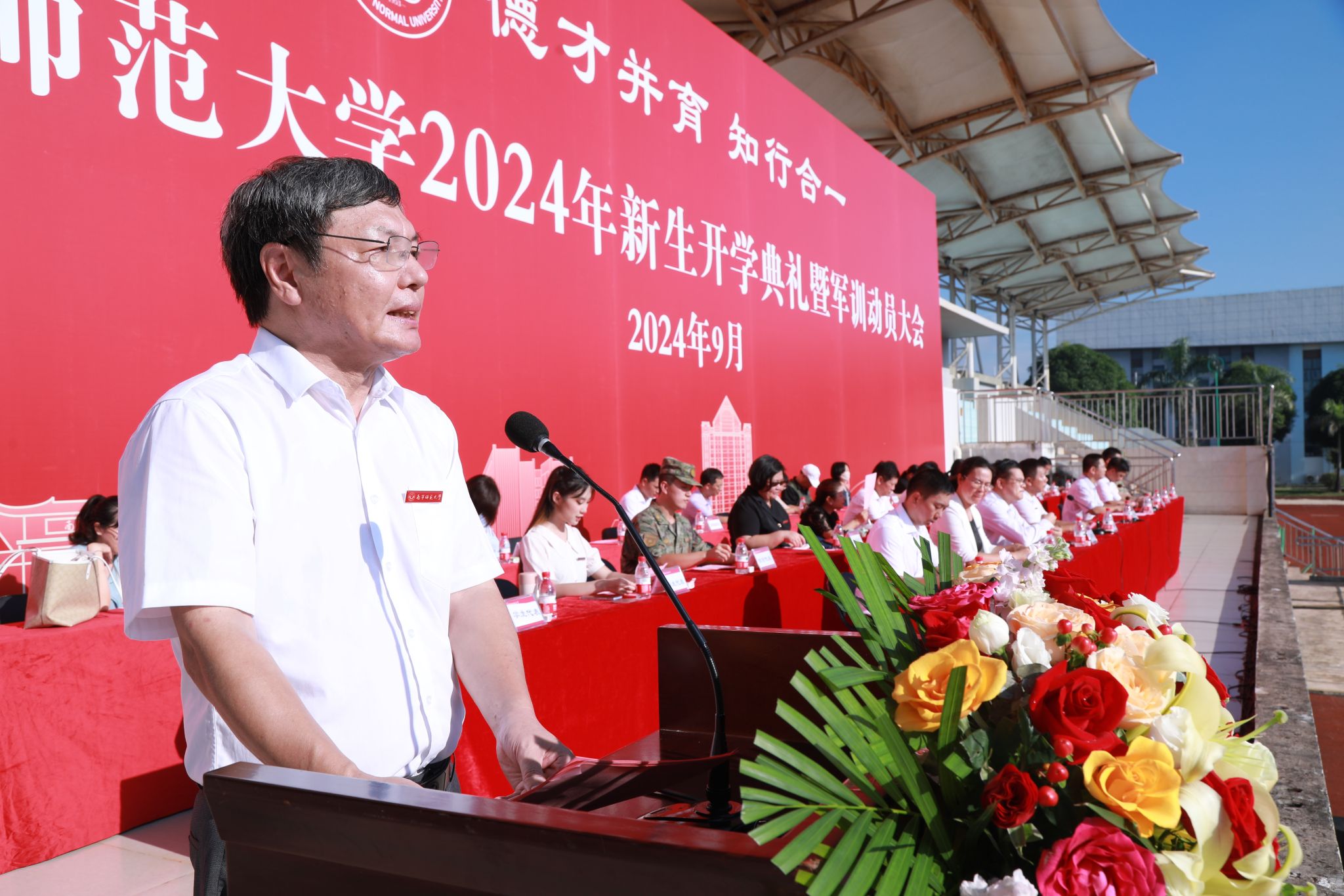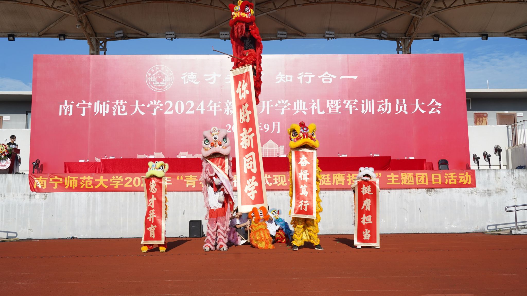 “同学们,当你们迈入南宁师大校门的那一刻起,历史的接力棒就传递到你们手中。南宁师大将与最年轻的南师人同向同行、荣辱与共。期待你们用汗水见证成长、用初心映照未来、用责任守护荣光,书写属于自己热辣滚烫的青春!”两位校领导的良言寄语,如同一份厚重的新学期“见面礼”,感染启迪了新同学,现场掌声不断。