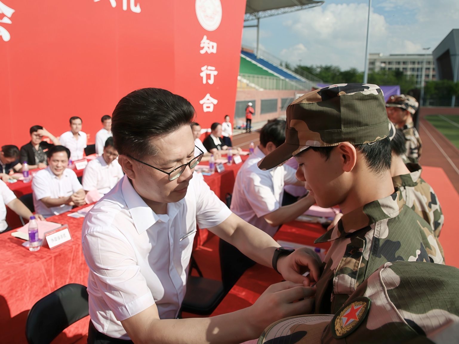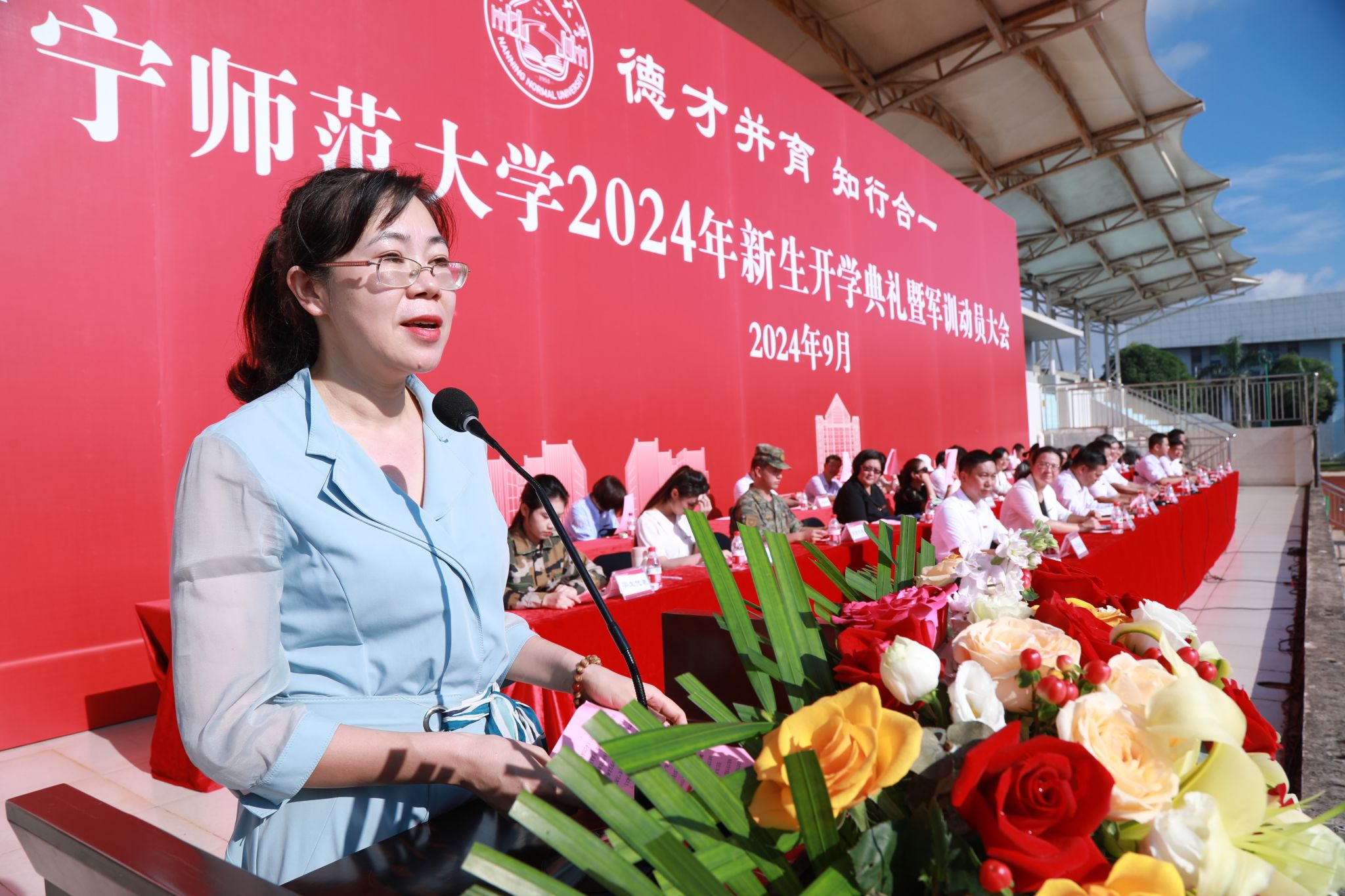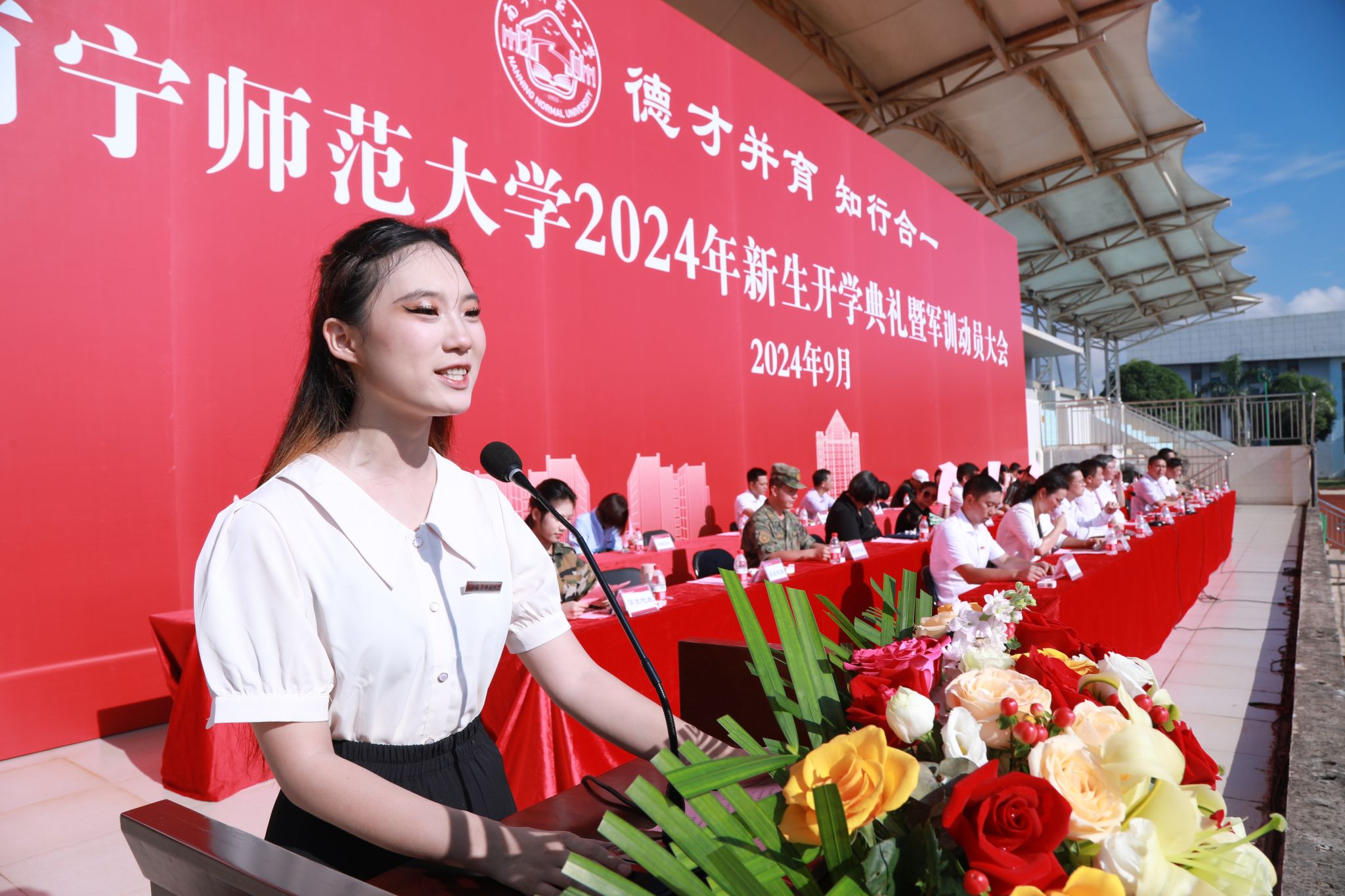校领导特别为新生代表佩戴校徽,寓意着新同学从此成为南宁师大的一份子,激励新同学以实际行动传承和践行“德才并育,知行合一”的南宁师大校训精神,奋力书写为中国式现代化挺膺担当的青春篇章。