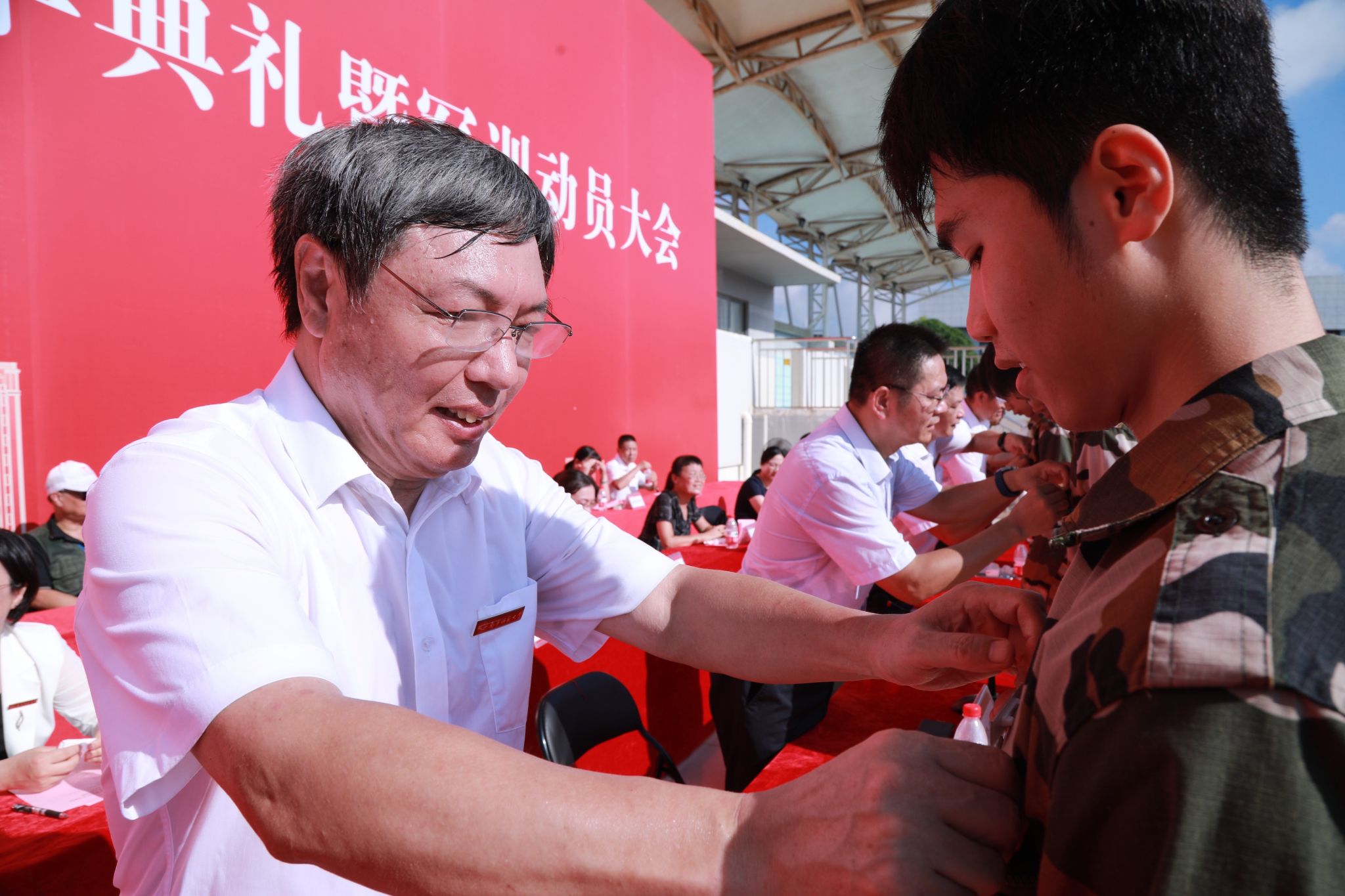 校党委书记张鹏为新生代表佩戴校徽