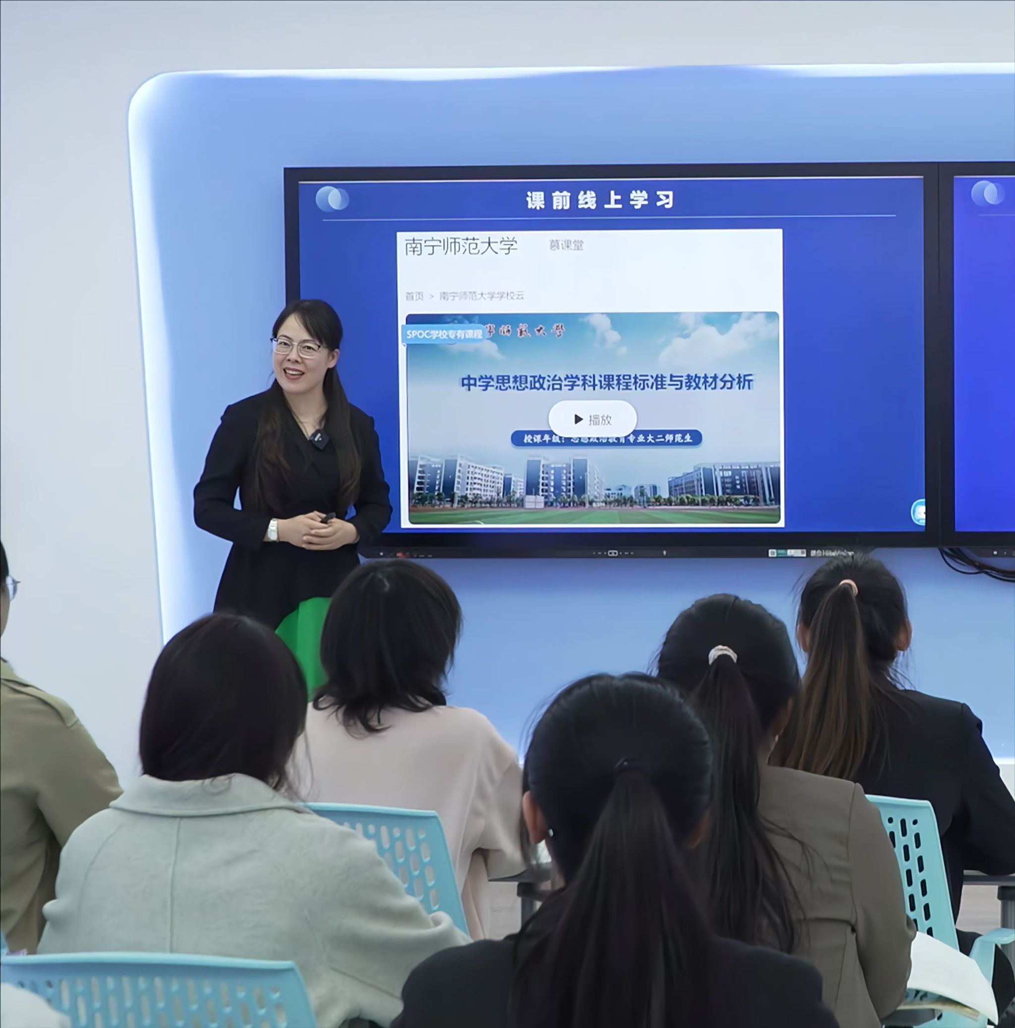 哪里有需要,团队就“行走”到哪里开展帮扶活动。中小学思政课教师希望得到教学成果培育方面的指导,温向莉就带领“行走的教研共同体”与“唐美忠思政课名师工作室”联合,在南宁沛鸿民族中学通过线上线下结合的方式开展“思政课教学成果培育”专题教研活动,30余所大中小学的思政课教师参加了专题教研活动。南宁市明天学校是一所九年一贯制学校,也是一所孤普融合学校,该校迫切希望得到帮扶,加强学校思政课教师队伍一体化建设,温向莉带领“行走的教研共同体”长期入校帮扶该校思政课教师队伍建设。