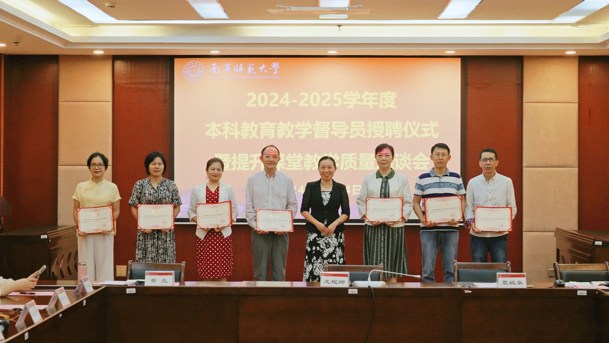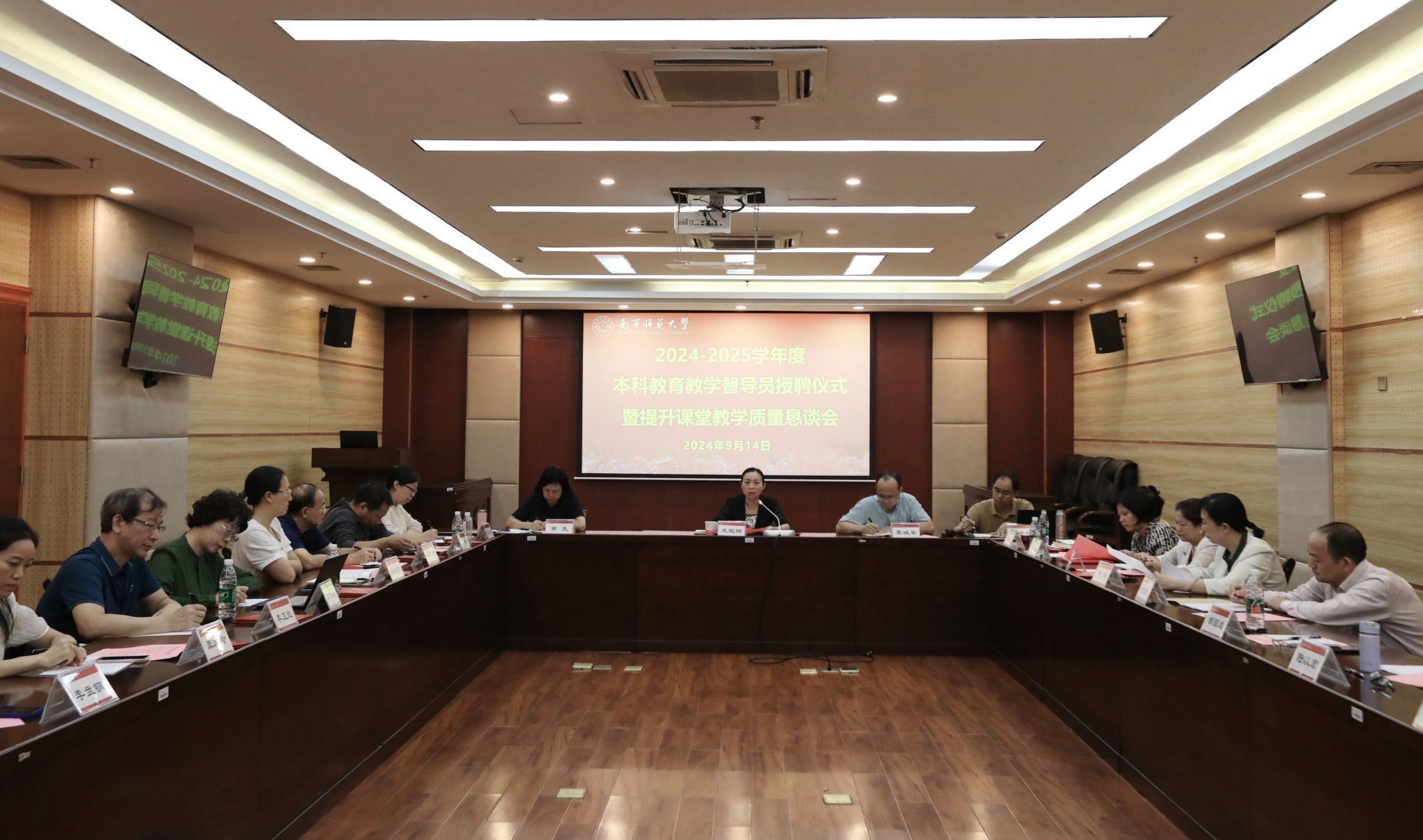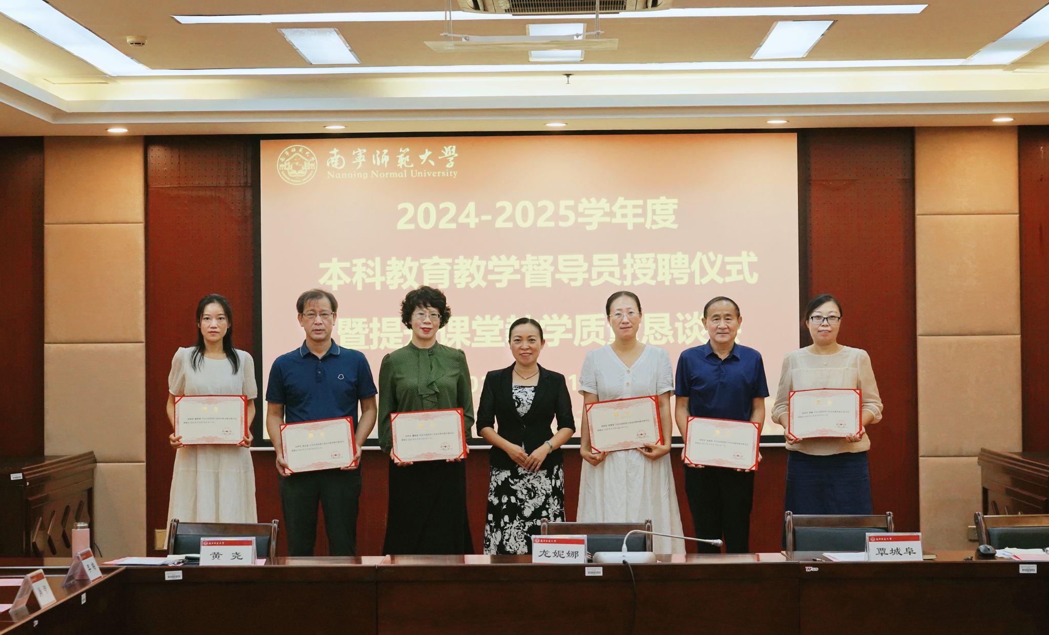 9月14日上午,我校在明秀校区图书馆2楼会议室召开2024-2025学年度本科教育教学督导员授聘仪式暨提升课堂教学质量恳谈会。学校副校长龙妮娜出席会议,南宁师范大学第六届本科教育教学督导员,教务处负责人,教育评价与教师发展中心全体人员参加了会议。会议由教育评价与教师发展中心负责人主持。