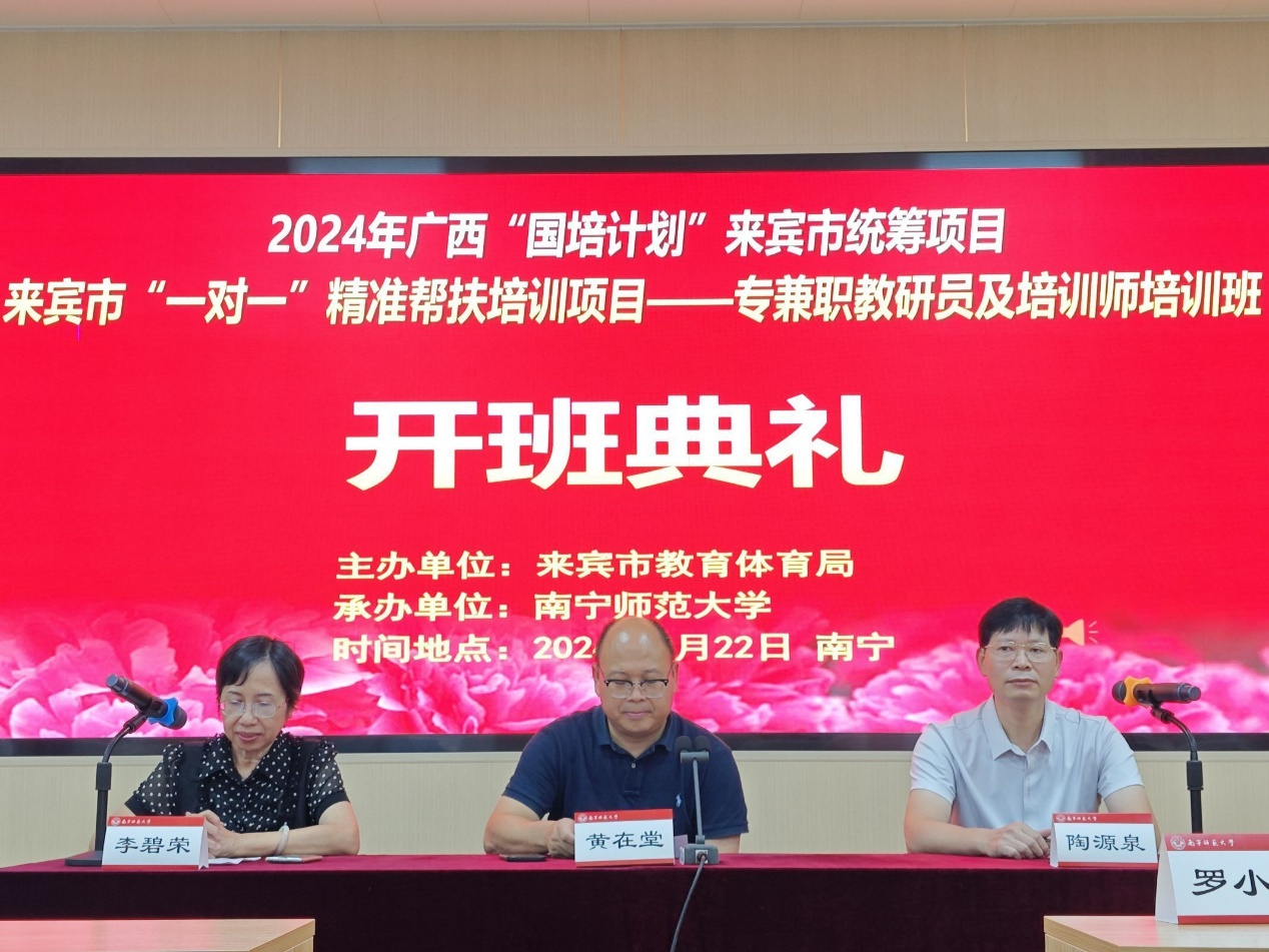 9月22日,由来宾市教育体育局主办、我校承办的2024年“国培计划”来宾市统筹项目来宾市“一对一”精准帮扶培训项目——专兼职教研员及培训师培训班在我校顺利开班。数学与统计学院黄在堂院长,教师教育学院院长助理项目规划与开发部主任陶源泉,以及来自来宾市的50位小学专兼职教研员及培训师参加了此次培训班开班典礼。