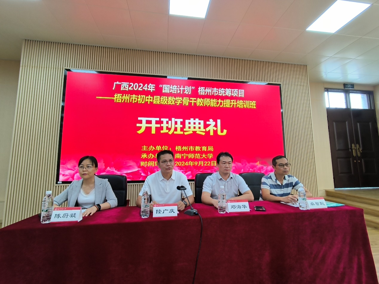 9月22日,由梧州市教育局主办、我校承办的2024年“国培计划”梧州市统筹项目——梧州初中县级数学骨干教师能力提升培训班顺利开班。学校党委副书记隆广庆,梧州市教育局党组成员、副局长邓海华,梧州市教师培训中心主任卓智聪,以及来自梧州市的70位初中数学骨干参加了此次培训班开班典礼。