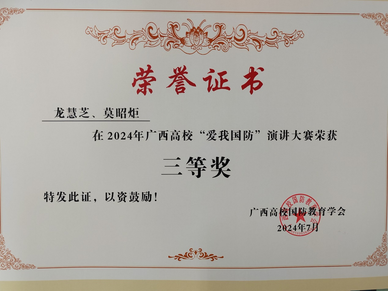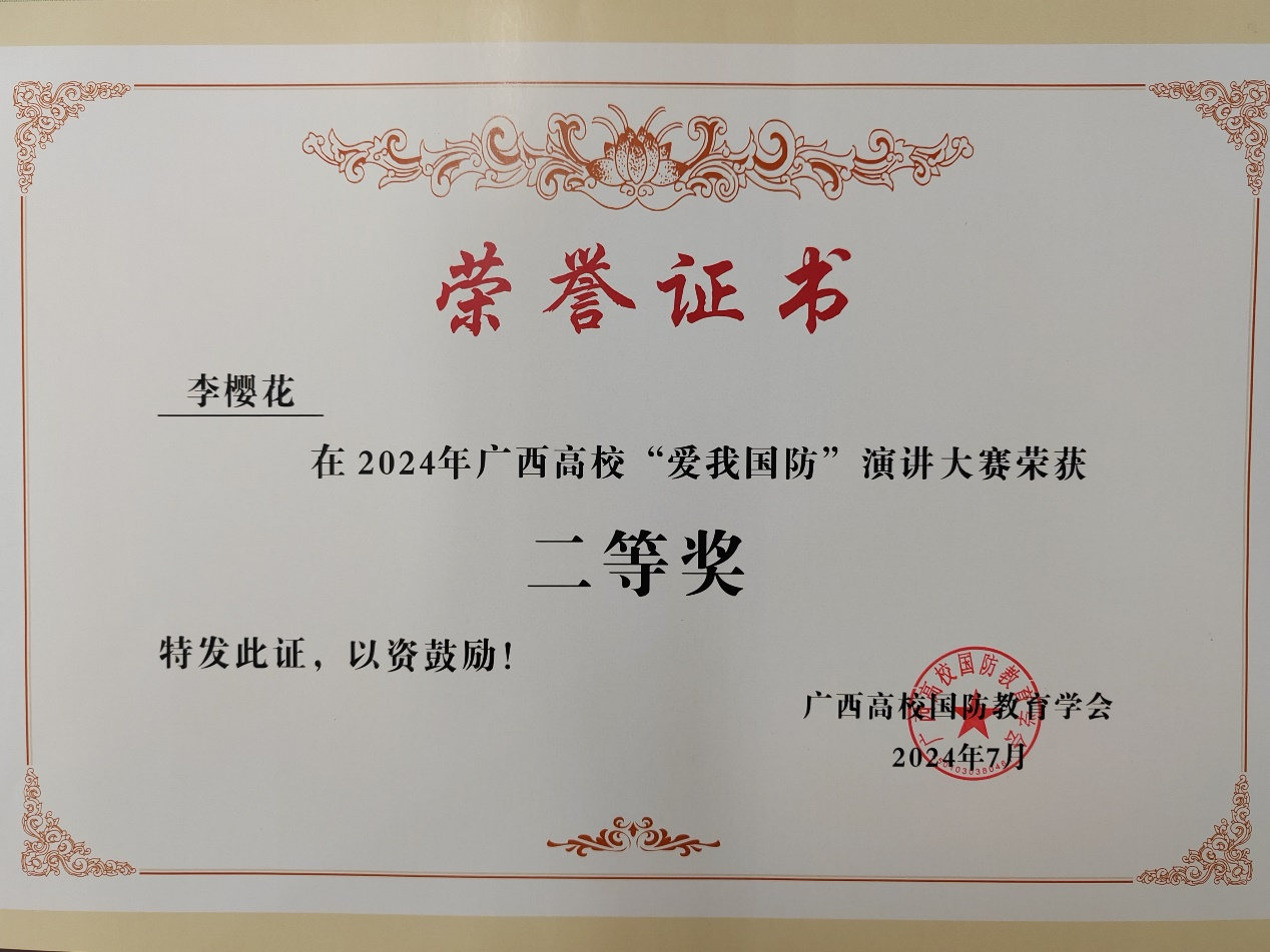 根据中央宣传部关于开展“强国复兴有我”主题宣传教育活动安排,由广西高校国防教育学会承办2024年广西高校“爱我国防”演讲大赛,已圆满落下帷幕。广西各大高校师生积极参赛,经过层层选拔,共有31所高校师生作品入围复赛,20个师生作品入围决赛。我校师生作品在激烈角逐中脱颖而出,新闻与传播学院团委书记李樱花老师的演讲作品《爱我国防,不负伟大时代》阐述了新时代全民国防教育的重大意义,表达对和平环境的珍视,树立时刻准备为实现强国梦强军梦而不懈奋斗的崇高理想,演讲作品入围决赛并荣获教师组二等奖。由李樱花老师指导的播音与主持艺术专业龙慧芝、莫昭炬同学的演讲作品《不忘初心,爱我国防》通过多人演讲的形式,讲述了对实现中国梦、强军梦的理解感悟,并荣获学生组三等奖。