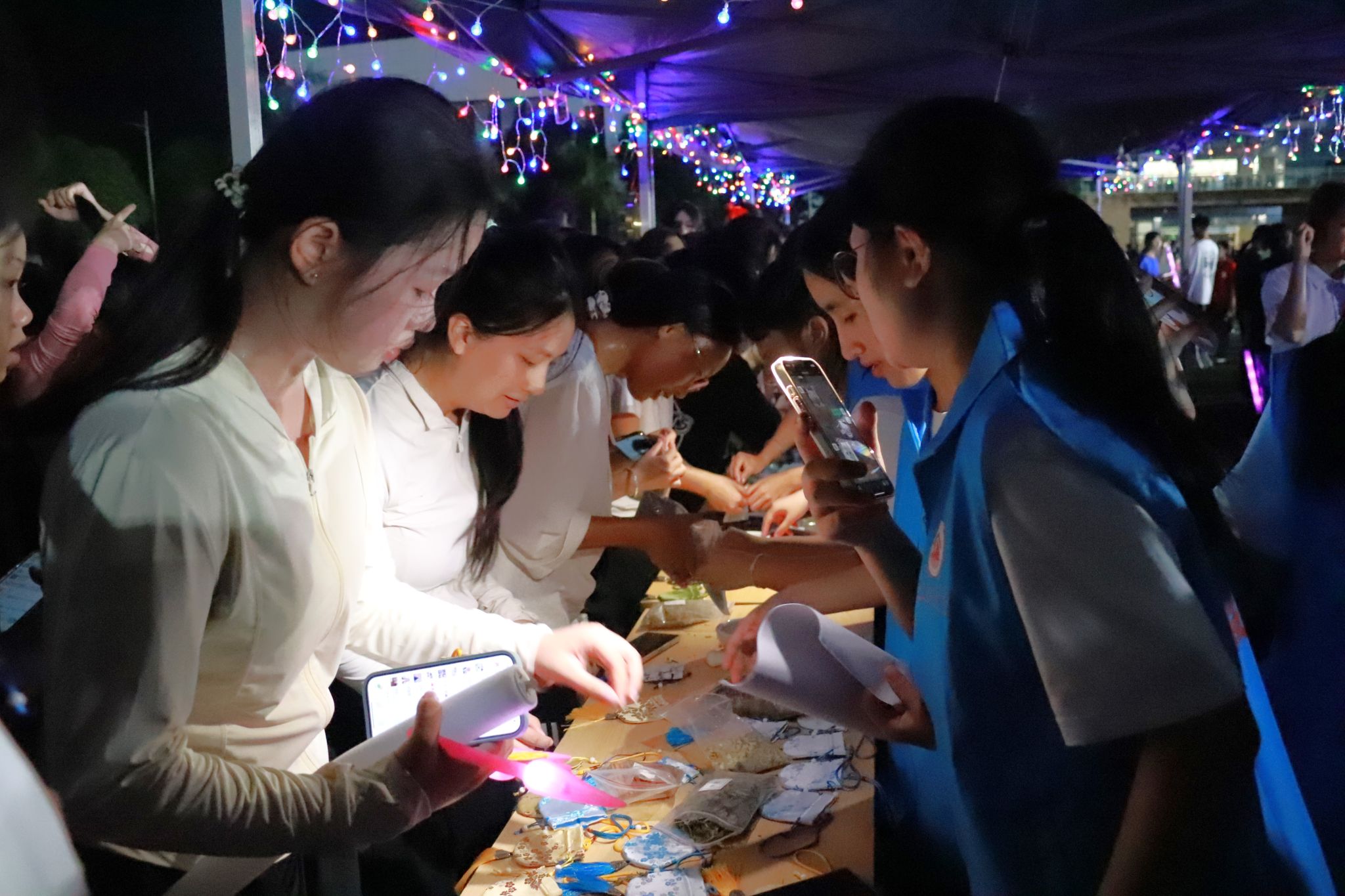 活动伊始,同学们挥舞着手中的荧光棒,摆出“1949”、“2024”和“75”数字方阵,从1949年到2024年,象征着中华人民共和国波澜壮阔的75年,大家齐声高唱《我和我的祖国》,用嘹亮的歌声向祖国告白。校团委老师宣布活动启动并鼓励同学们点燃运动热情,焕发青春活力,让荧光点亮前行路。同学们头戴发光牛角,手持荧光棒与星星灯,从明秀、五合足球场和武鸣松园体育场开始集体环校夜跑,在校园的主干道绘就刚健威武、勇猛无畏的“中国龙”。另外还设置了表情包猜成语、DIY香囊、转布条和闭眼敲锣等游园活动,喜迎国庆氛围浓厚。