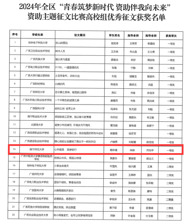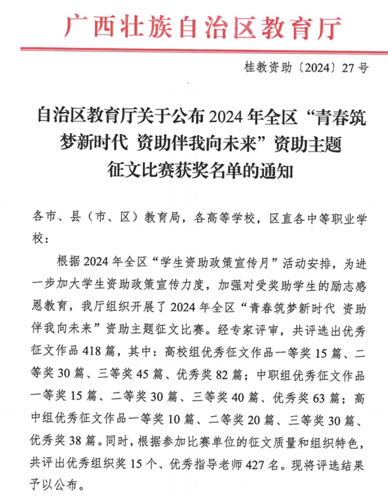 在2024年全区“青春筑梦新时代,资助伴我向未来”资助主题征文比赛中,我校获高校组一等奖、优秀奖各1项,优秀指导教师奖2项,充分展示了学校在资助育人领域的显著成效。