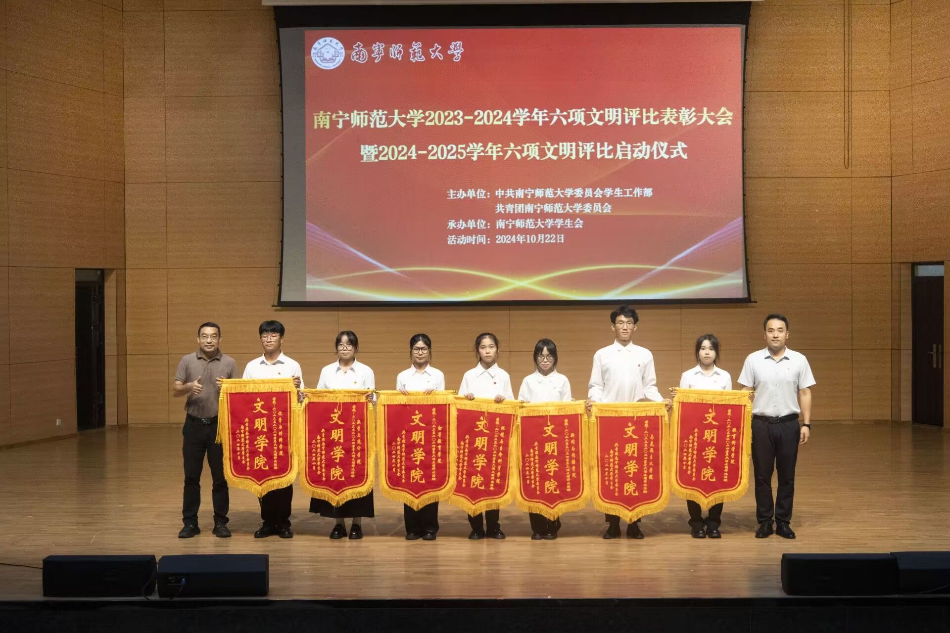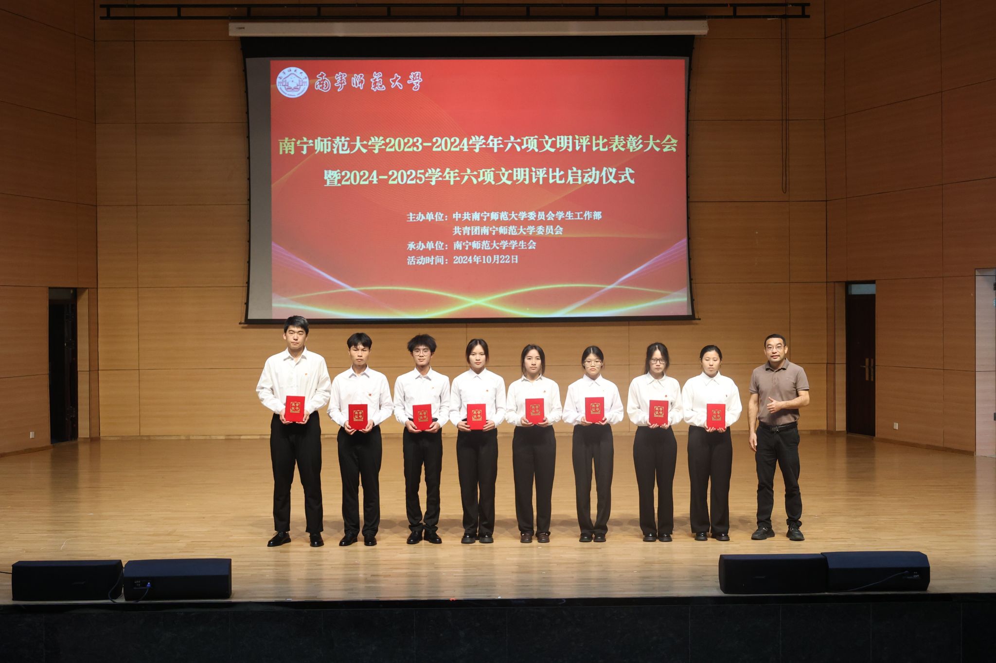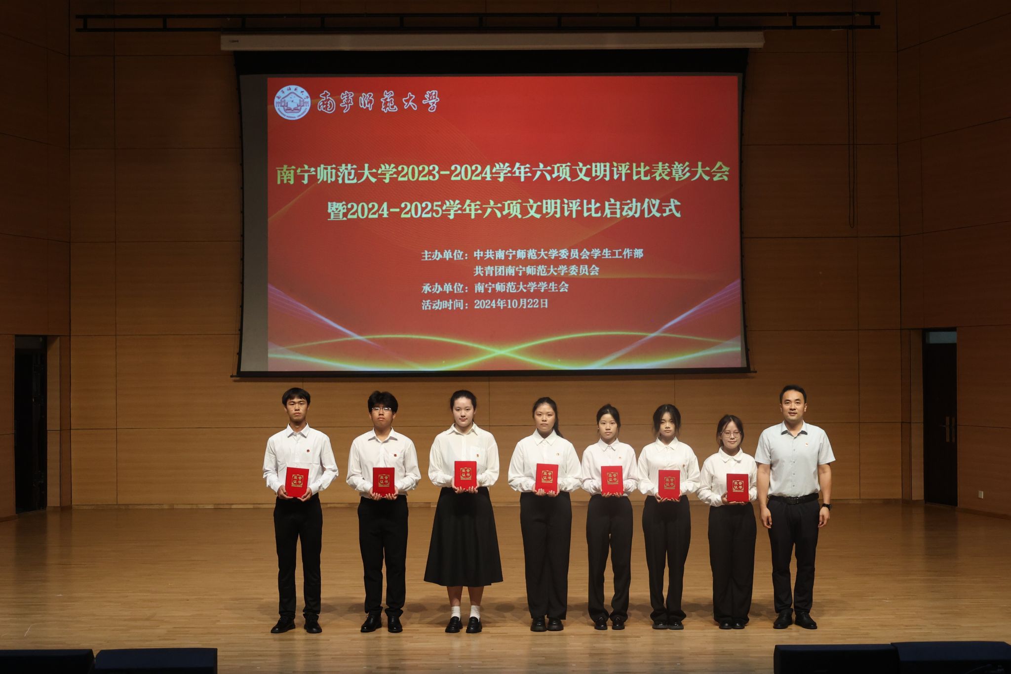 党委学生工作部、校团委负责人分别为获得2023-2024学年六项文明评比“先进个人”“文明班级”“文明学院”的代表颁奖。校团委副书记何俊斌为本次活动作总结讲话,他充分肯定了过去一年六项文明评比活动中取得的成绩,同时对新学年的六项文明评比工作提出了三点希望:一是凝聚理想共识,提高文明素养;二是深化交流协作,搭建沟通桥梁;三是学会共建共享,铸就和谐校园。党委学生工作部副部长何健宣布南宁师范大学2024-2025学年六项文明评比活动正式开启。