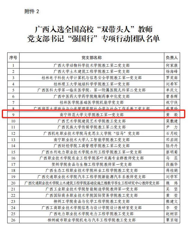 近日,教育部办公厅印发《关于公布全国高校“双带头人”教师党支部书记“强国行”专项行动团队名单的通知》,我校文学院教工第一党支部入选全国高校“双带头人”教师党支部书记“强国行”专项行动团队。