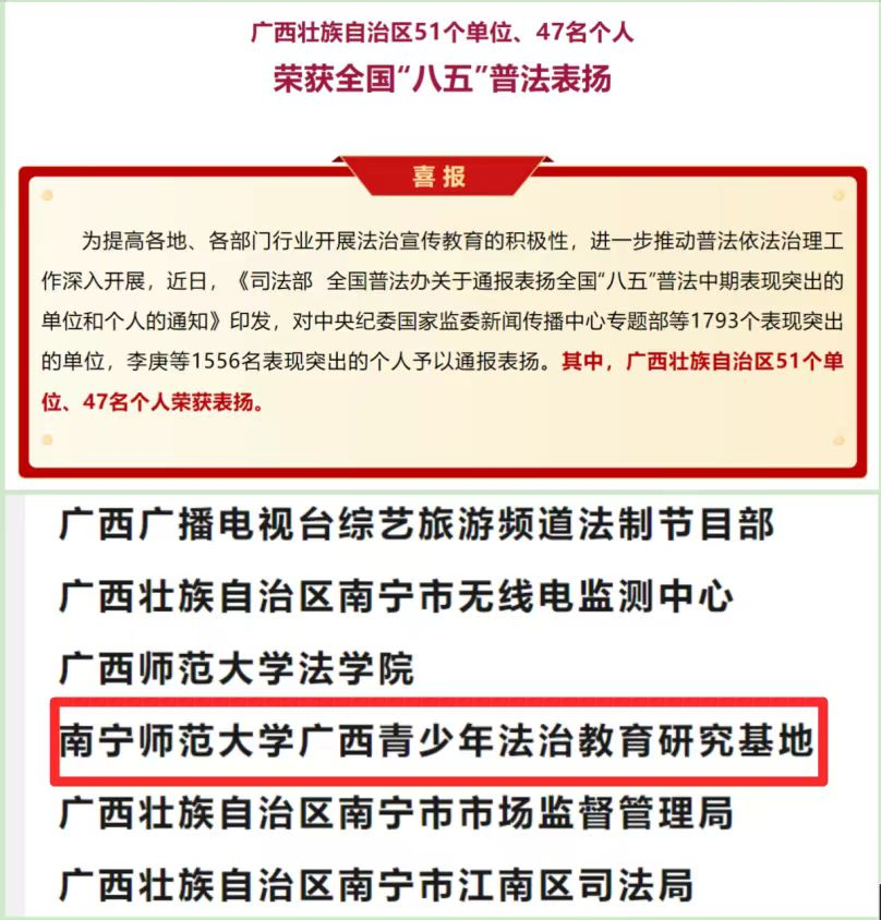 为提高各地、各部门行业开展法治宣传教育的积极性,进一步推动普法依法治理工作深入开展,近日,《司法部全国普法办关于通报表扬全国“八五”普法中期表现突出的单位和个人的通知》印发,我校广西青少年法治教育研究基地荣获全国“八五”普法中期表现突出单位。