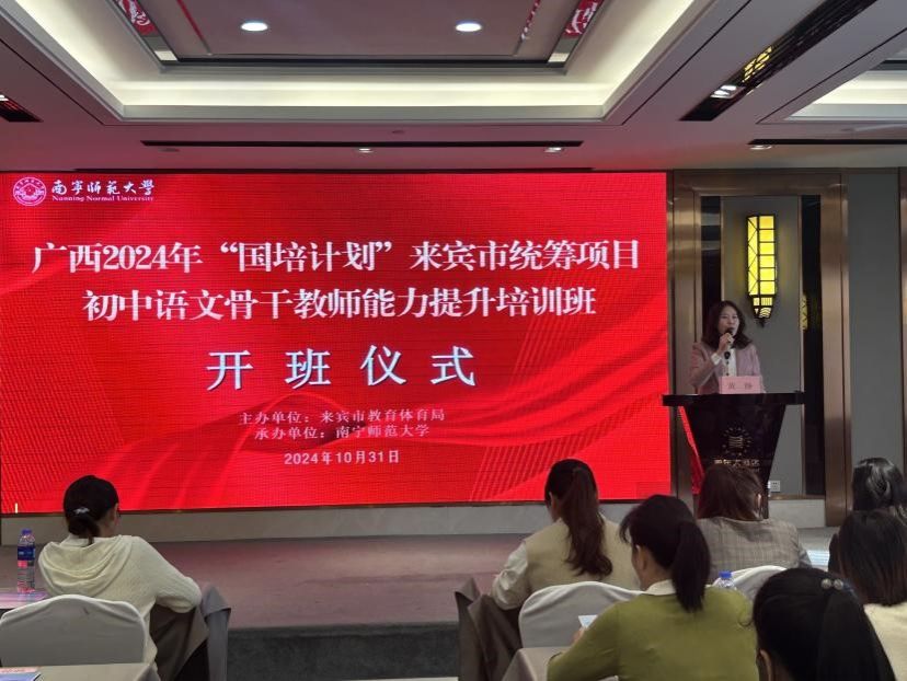 为强化教师职业道德建设,并着力提升来宾市初中语文骨干教师的教育教学综合能力,10月30日至11月6日,2024年“国培计划”来宾市统筹项目初中语文骨干教师能力提升培训班在长沙进行。本次培训由来宾市教育体育局主办,南宁师范大学承办,50名初中语文骨干教师参与培训。