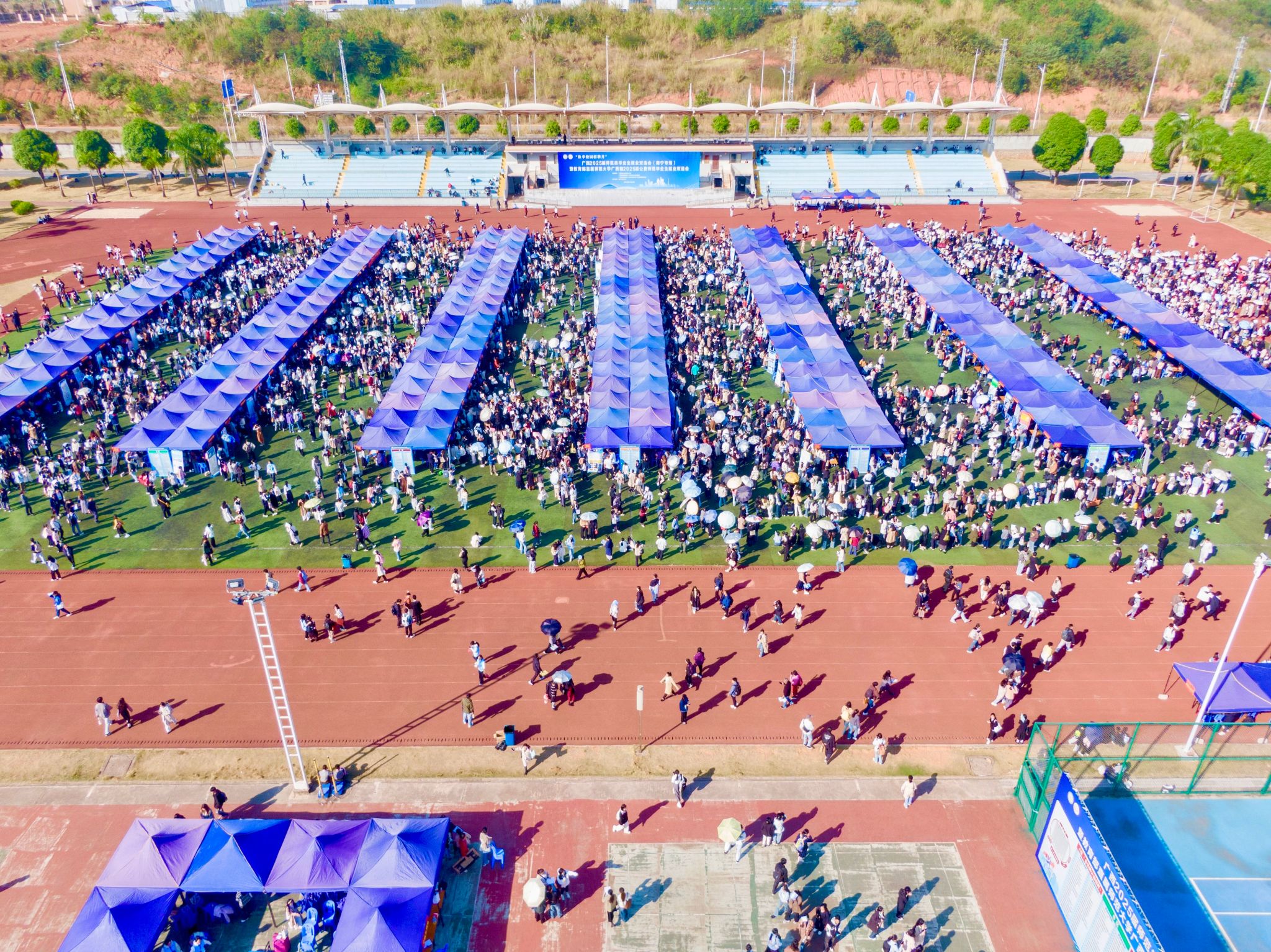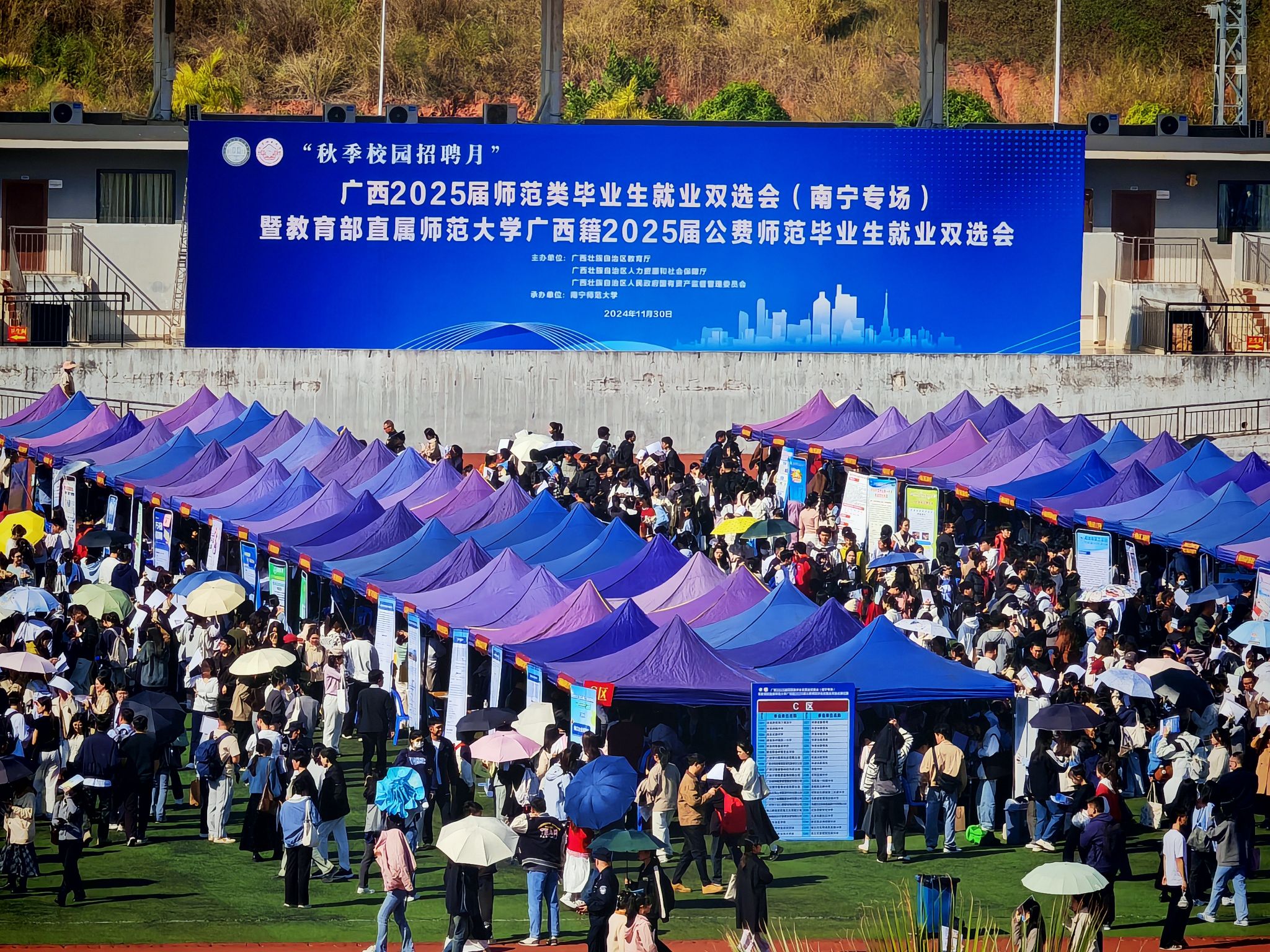 11月30日,为认真贯彻落实党中央、国务院和自治区党委、政府“稳就业”“保就业”决策部署,广西2025届师范类毕业生就业双选会(南宁专场)暨教育部直属师范大学广西籍2025届公费师范毕业生就业双选会在我校五合校区田径运动场顺利举办。