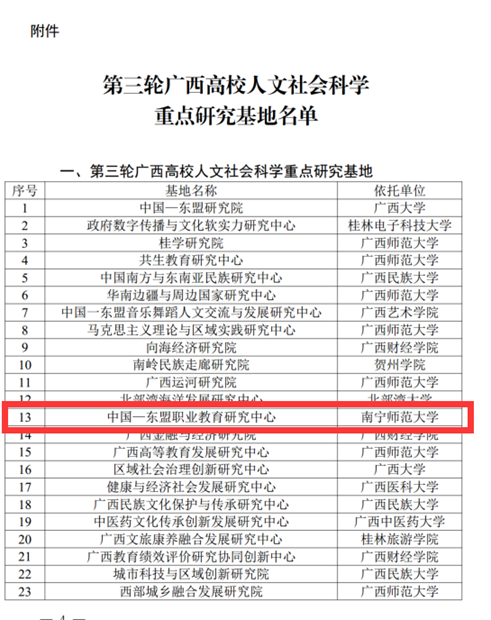 近日,广西壮族自治区教育厅公布第三轮广西高校人文社会科学重点研究基地的名单,我校职业技术师范学院申报的“中国—东盟职业教育研究中心”获批广西高校人文社会科学重点研究基地。