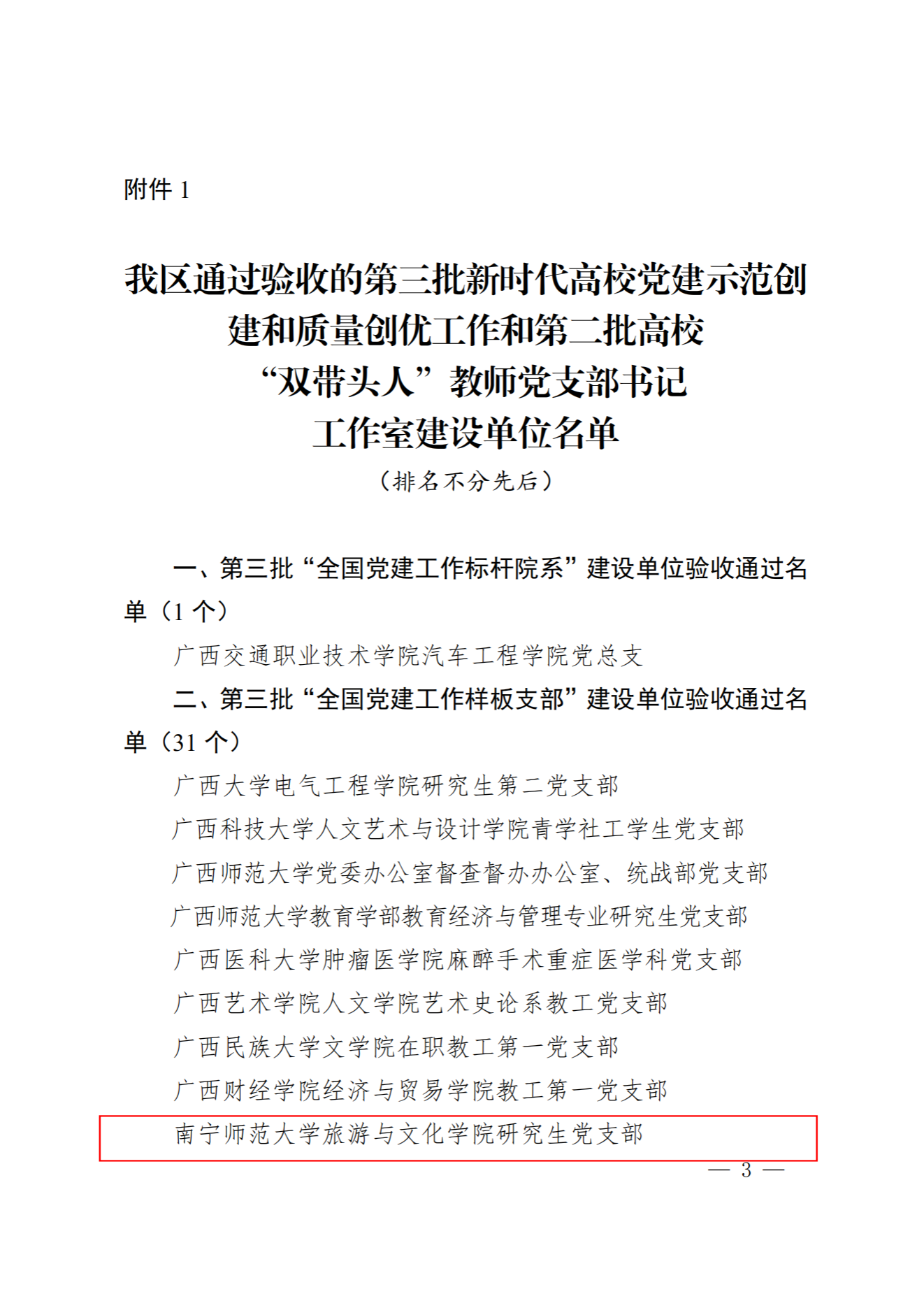 近日,教育部办公厅印发了《教育部办公厅关于公布第三批新时代高校党建示范创建和质量创优工作和第二批高校“双带头人”教师党支部书记工作室建设单位验收结果的通知》,我校旅游与文化学院研究生党支部、马克思主义学院思想政治理论课教师第一党支部顺利通过验收。