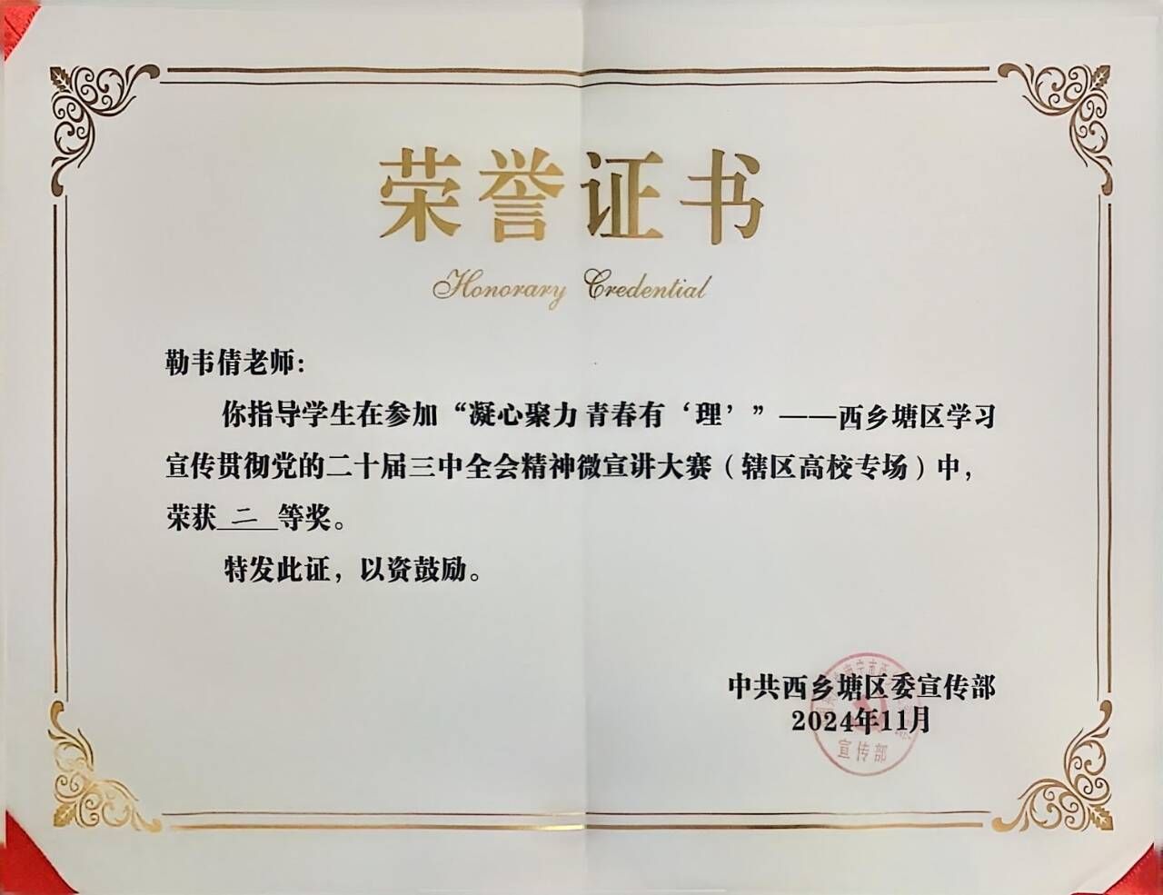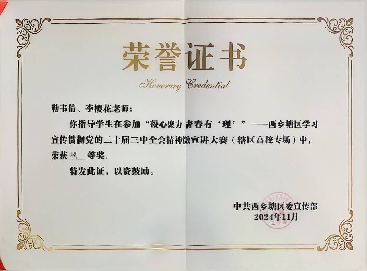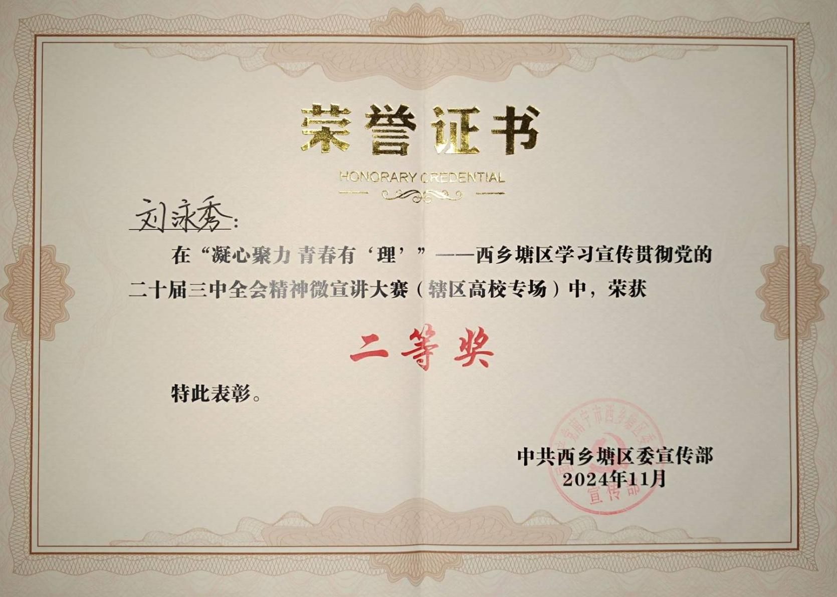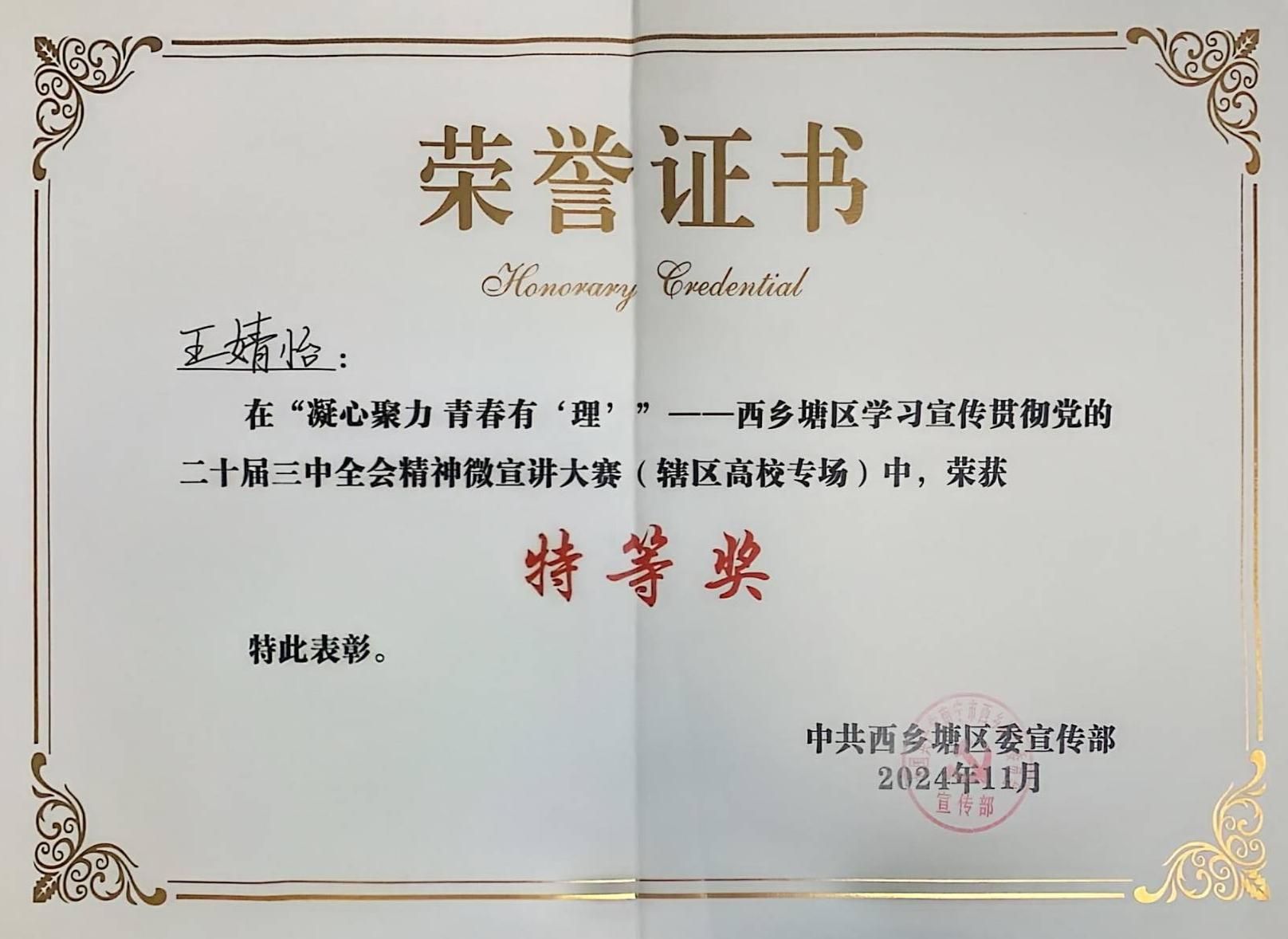 近日,由中共西乡塘区委宣传部主办的凝心聚力,青春有“理”——西乡塘区学习宣传贯彻党的二十届三中全会精神微宣讲大赛(辖区高校专场)圆满落下帷幕,我校新闻传播学院王婧怡同学荣获特等奖、马克思主义学院刘泳秀同学荣获二等奖。