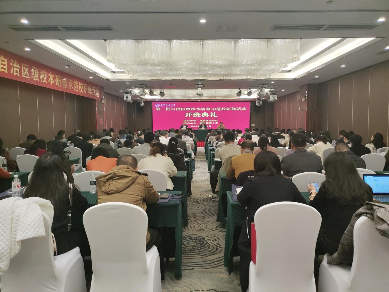 12月8日,由自治区教育厅主办、我校承办的第一批自治区级校本研修示范校研修活动在我校顺利开班。来自全区的第一批自治区级校本研修示范校、14个设区市教师培训中心和教学研究室的主要负责人共130余人参加了此次研修活动。开班仪式由我校教师教育学院副院长黄明格主持。