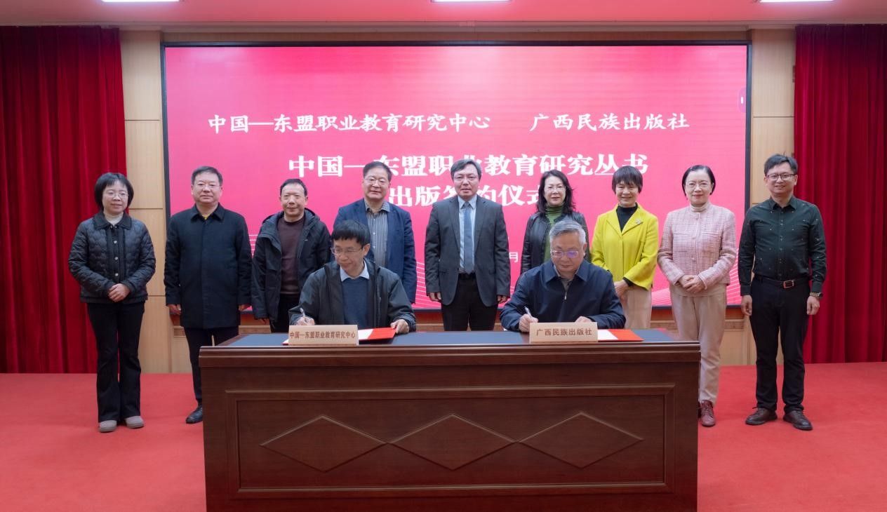 在与会专家见证下,中国—东盟职业教育研究中心与广西民族出版社举行了“中国—东盟职业教育研究丛书”出版签约仪式。“中心”副主任唐锡海作为代表与出版社签署出版协议。签约标志着丛书编纂出版工作正式进入了实质性阶段。