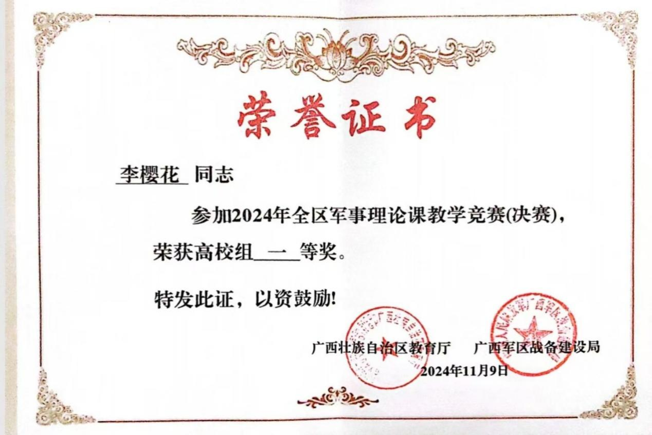 3月6日,2024年度广西高校国防教育学会年会暨2025年工作会议在广西现代职业技术学院圆满举行。会议除了探讨国防教育高质量发展之策外,还对2024年度全区军事课教学竞赛的优秀教师进行表彰,我校李樱花老师荣获高校组一等奖。