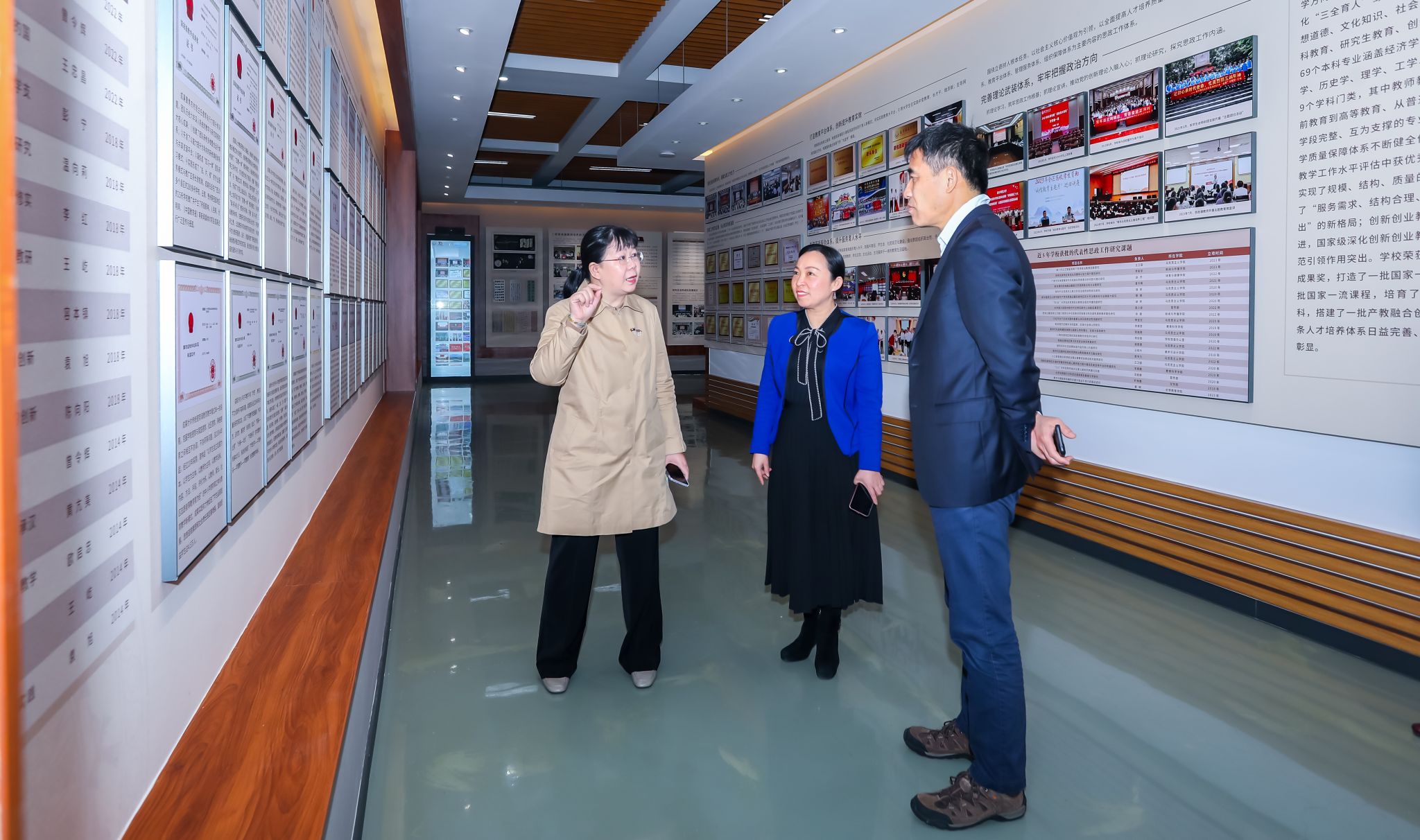 学校校长隆广庆会见鹿旭忠。在副校长龙妮娜及招生就业处、教师教育学院相关负责人的陪同下,鹿旭忠前往武鸣校区开展实地调研。调研组一行先后走访了办学成果展厅、中国-东盟职业教育研究中心、旅游与文化学院实训基地、音乐与舞蹈学院教学实践课堂以及大学生创业孵化园。龙妮娜向鹿旭忠重点汇报了师范专业人才培养特色、教师教育职前职后一体化、职业教育国际化合作、非师专业产教融合机制创新及“双创”育人体系建设等情况。