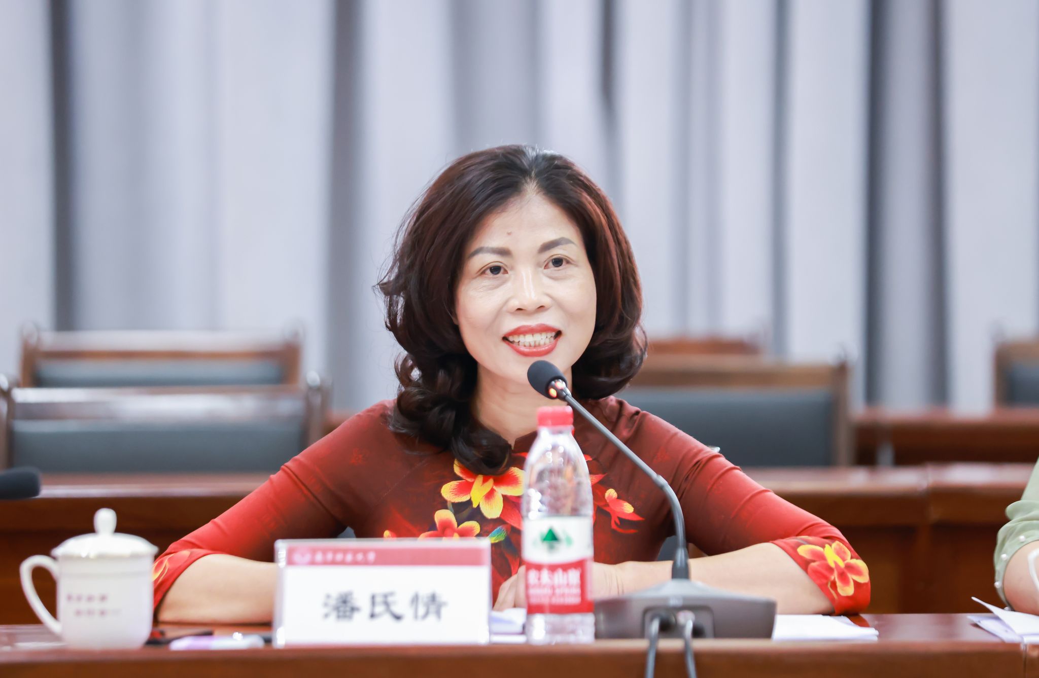 潘氏情对学校的热情接待表示感谢,对南宁师范大学近年来取得的成绩感到赞叹。她简要介绍了越南雄王大学近年来发展情况及国际化办学优势和特色,表达了深化良好教育合作关系,实现合作共赢的愿景,希望在师生互访、人文交流、文化传播等方面多元交流赋能,为两国的友好合作培养更多优秀的专业人才。