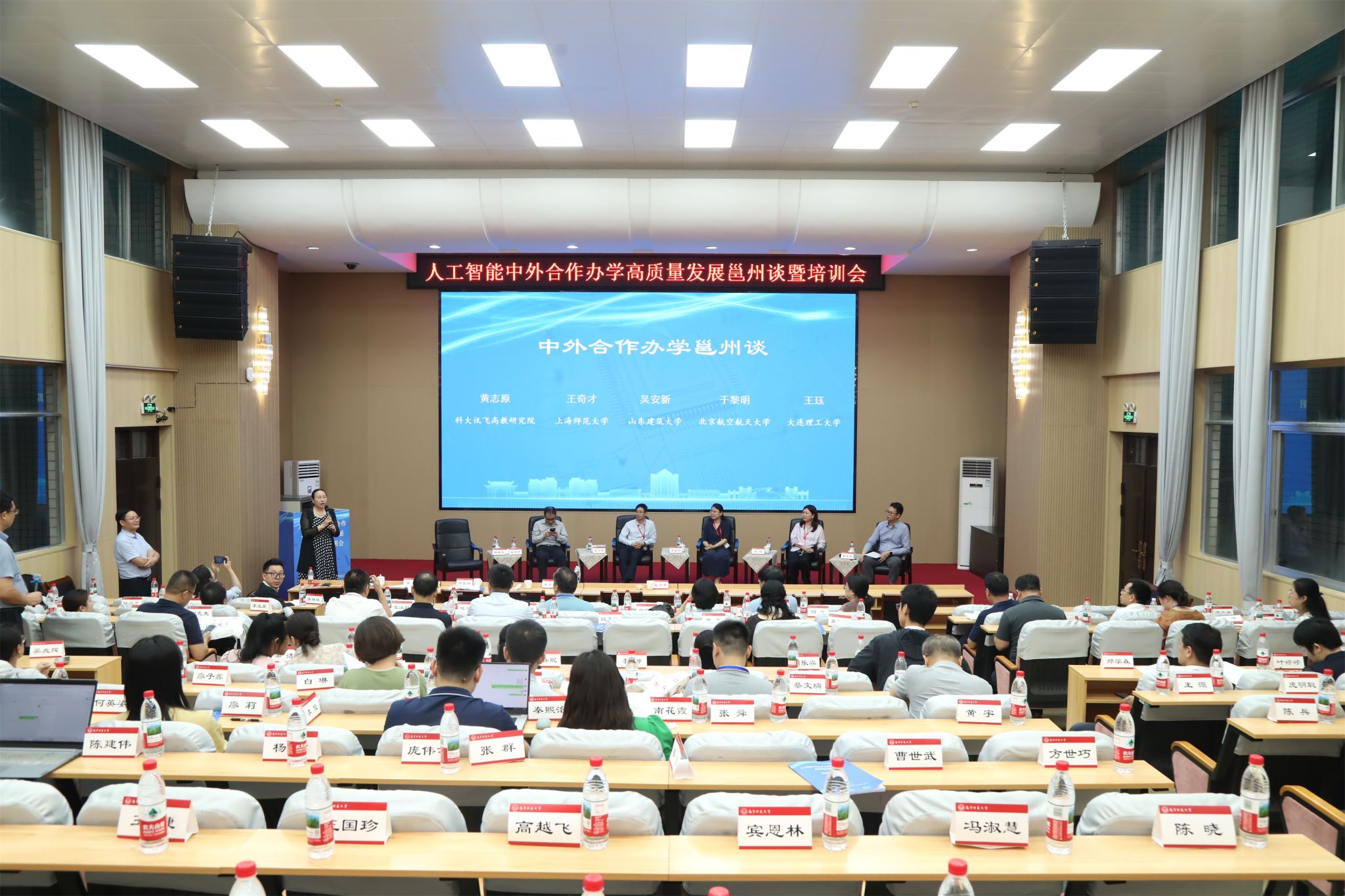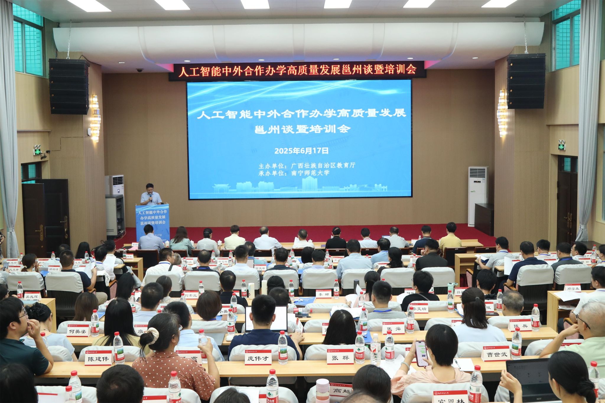 近日,人工智能中外合作办学高质量发展邕州谈暨培训会在南宁举办。会议由自治区教育厅主办、我校承办。自治区教育厅二级巡视员罗耀光,我校副校长龙妮娜出席会议并致辞。来自区内外的相关专家,自治区教育厅有关处室负责人,全区开设人工智能专业或中外合作办学项目的高校相关负责人参加会议。