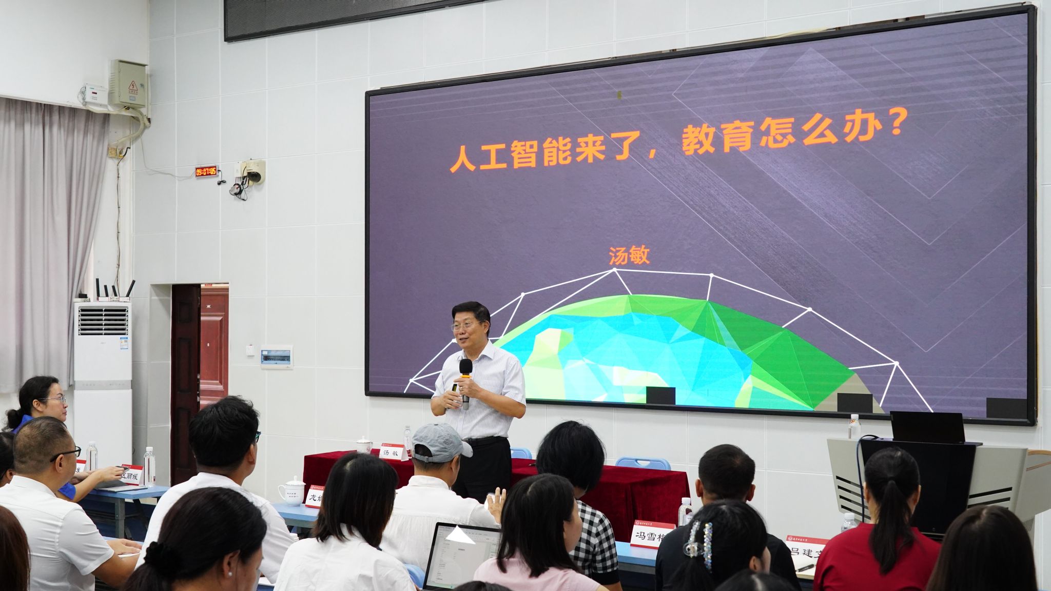 下午讲座在五合校区文楼114报告厅举行。自治区新闻出版局原党组成员、纪检组组长、原副巡视员陈小建校友,自治区质量技术监督局原巡视员门传真校友,初等教育学院400名师生代表到场聆听。针对初等教育领域特性,汤敏特别强调“基础教育阶段需植入AI思维”,建议师范生既要提升自身数字素养,更要学会用AI工具设计个性化教学,避免“将人训练成机器”的误区。