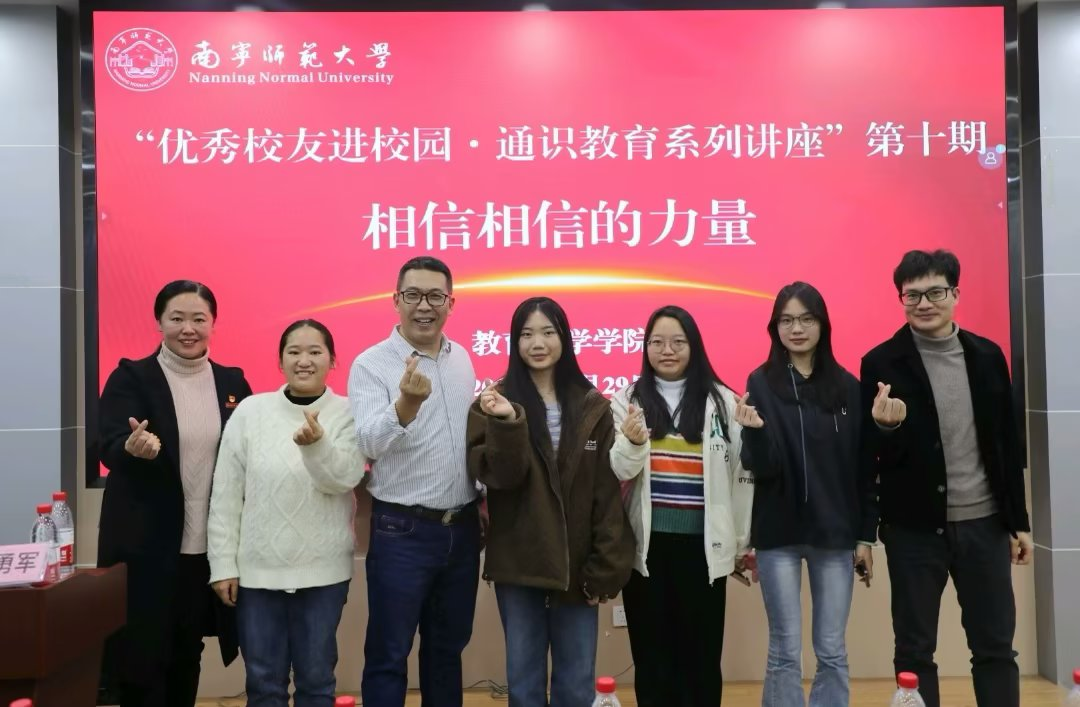 为落实立德树人的根本任务,践行“德才并育,知行合一”的校训精神,帮助学生增强处理,教育科学学院于2023年12月29日在五合校区理楼1003会议室举行了以《相信相信的力量》为主题的“优秀校友进校园·通识教育系列讲座”活动。讲座邀请教育科学学院2006级教育经济与管理专业优秀校友、美丽南方青瓦房党支部书记兼副总、广西社会心理学会副会长赵勇军主讲。学院党委书记庞芳,院长李强,2001级校友韦国才出席了讲座。本次讲座由学院党委副书记谢珊主持,本科生各班90多名代表参加。