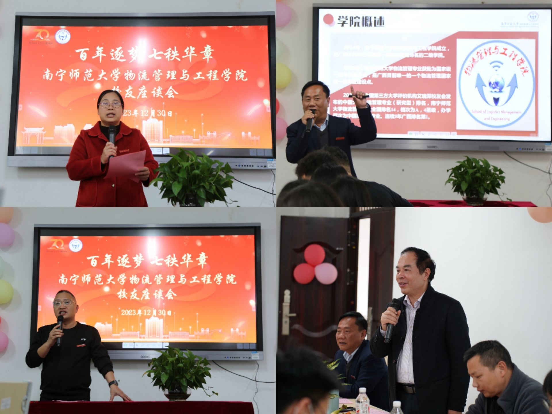 2023年12月30日,物流管理与工程学院在武鸣校区开展70周年校庆系列活动。学院党政领导班子、教职工以及64名校友代表参与了学校、学院所举办的各项庆祝活动。