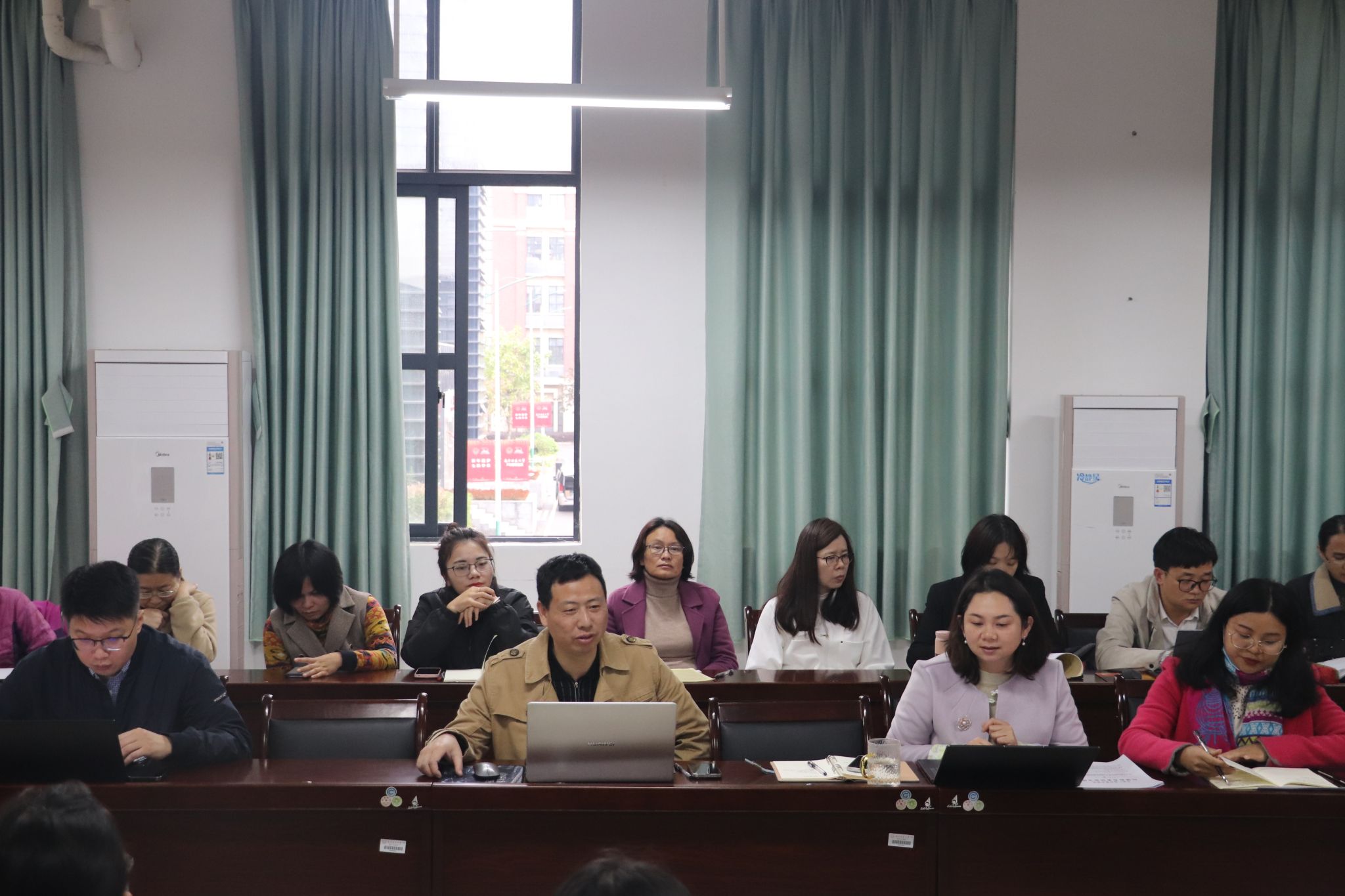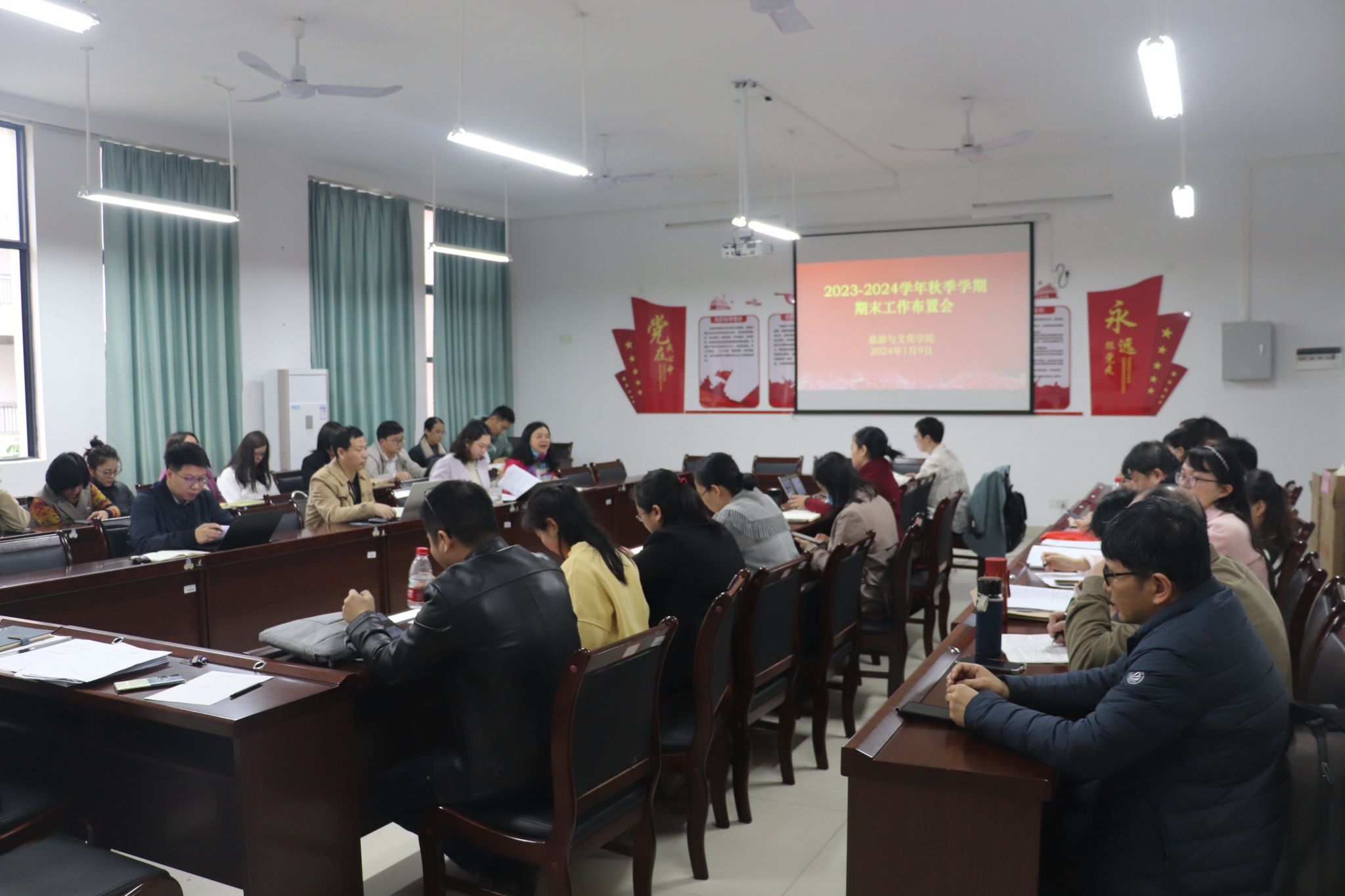 1月9日上午,旅游与文化学院在武鸣校区地信楼B201会议室召开全体教职工大会,安排部署2023-2024学年秋季学期期末工作。会议由学院党委副书记、院长段文军主持,全体党政领导班子、教职工参加会议。