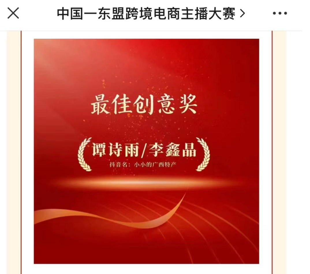 大赛于2023年7月21日正式启动,10月17日完成决赛。赛前谭诗雨同学和李鑫晶同学了解到,本次比赛一同竞争的还有来自东盟国家的友人共同参赛。她们毫不畏惧,在心中立下必胜的决心。两人发挥各自所长,认真研究新媒体平台上的热门视频并寻找创意点,仔细打磨并钻研,在每一次开播前认真研究直播话术寻找产品闪光点,力求创新,并用百分之一百的热情面对每一阶段比赛。从海选到初赛再到复赛、决赛,一路过五关斩六将。最终入围十强,斩获单项奖“最佳创意奖”。