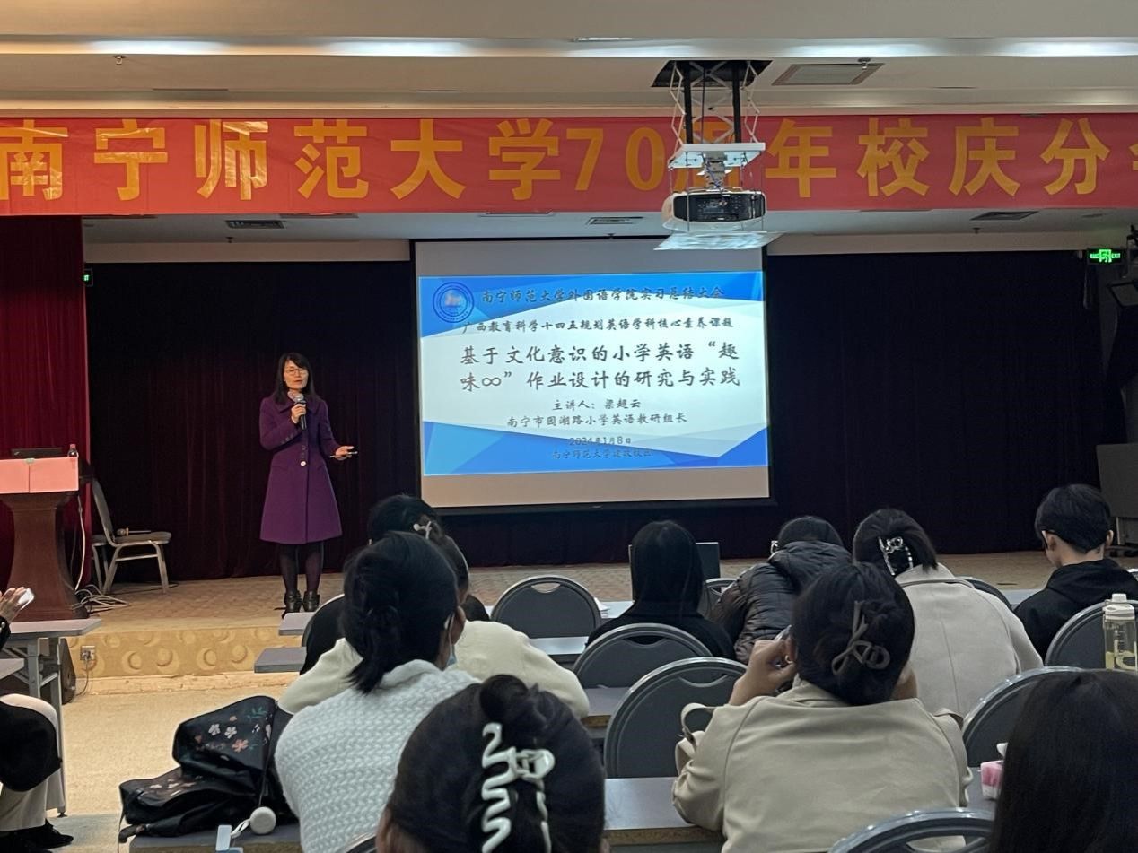 接着,南宁市园湖路小学英语教研组长梁超云老师做“向下扎根 向上成长 教书育人相统一”为主题的讲座。她首先对我院南宁市园湖路小学实习生的实习工作表示肯定,认为他们能认真完成各项教育实习的任务并能够积极参加实习学校的教研活动,协助学校大型活动的开展,教育实习成果是可喜的;接着梁老师从听、说、读、写四个方面给实习生做了小学英语学科教育教学专业成长及提升的建议。梁超云老师还与我们分享了她的课题——基于文化意识的小学英语“趣味∞”作业设计的研究与实践。梁老师从新课程理念出发,就作业设计的概念、价值与意义、设计的基本流程、要求和策略五方面深入浅出地阐明了素养导向是小学英语单元作业设计的方向。从培育学生的文化意识方面强调作业的过程本身也是全面育人的过程,单元作业设计要在核心素养培育的时代里充分发挥立德树人的根本任务。