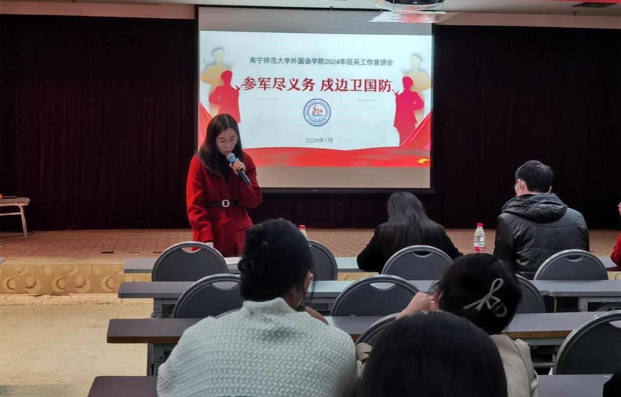 为响应"参军入伍,报效祖国"的国家号召,扩大在校园的宣传力度,2024年1月8日下午,南宁师范大学外国语学院于教育大厦18楼报告厅召开2024年征兵工作宣讲会。外国语学院副院长高飞雁、外国语学院辅导员兼毕业班班主任邓梦芸老师、2021级普专全体在校师生参加本次活动,活动由辅导员主持。