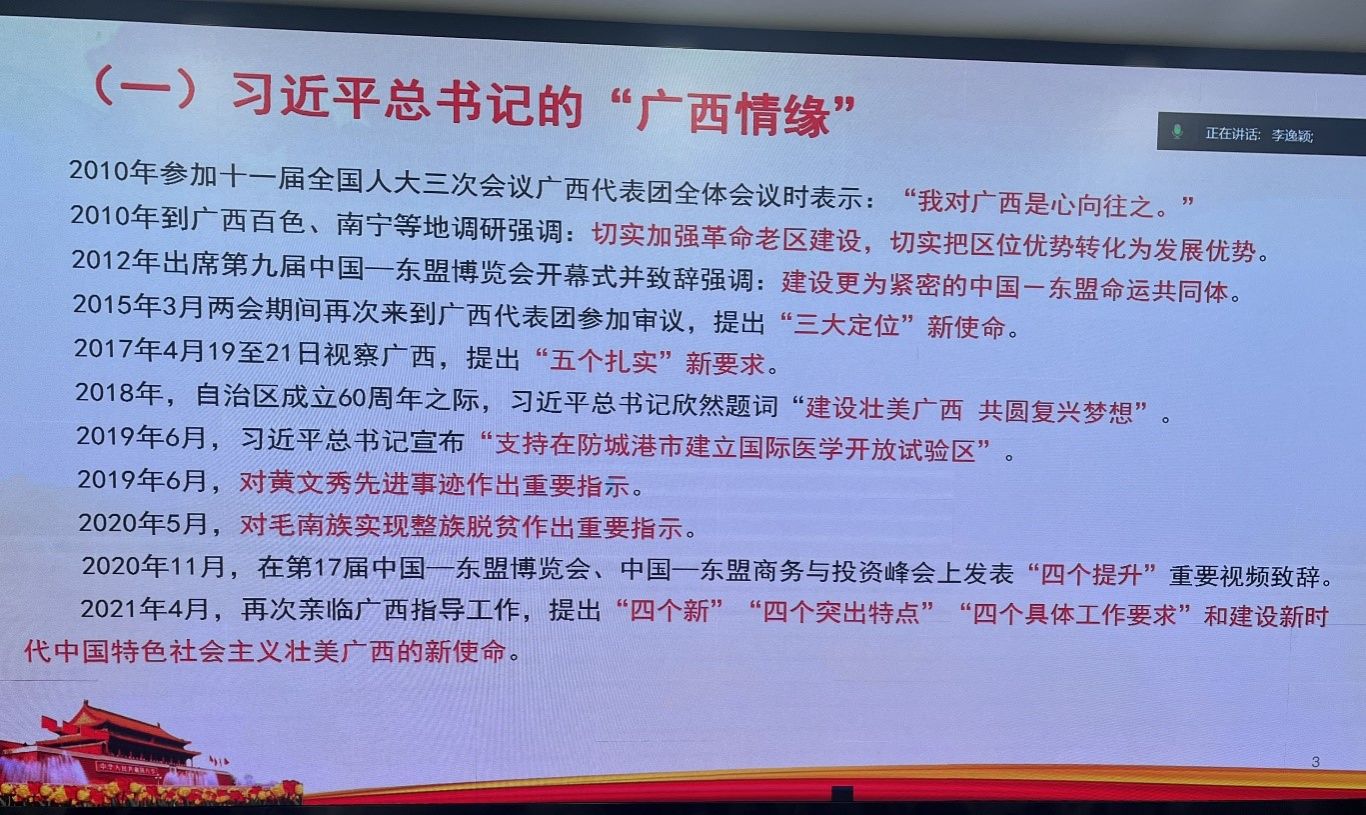 谢珊副书记介绍了2023年12月14日至15日习近平总书记在南宁、来宾对对外开放项目、社区、农村、企业等的调研,以总书记来广西考察所作的重要讲话为主要内容,向支部党员和入党积极分子重点讲解了习近平总书记来广西考察讲话的十六个字“解放思想、创新求变,向海图强、开放发展”。“解放思想、创新求变”,既是针对广西一域的要求,也有针对全国大局的考量;“向海图强、开放发展”,是广西的机遇和优势,也是广西的责任和使命。谢珊副书记还结合2010年以来习近平总书记历次对广西所作的指示、考察等,向同志们介绍了习近平总书记对广西高质量发展的始终关注,详细讲解了2021年4月,总书记在上一次赴广西考察时,提出的“四个新”的要求,2022年年10月,总书记在参加党的二十大广西代表团讨论时,强调的“五个更大”,以及这次考察,总书记再次强调的“更大作为”,强调推动广西高质量发展,必须做好强产业的文章,加快构建现代化产业体系。