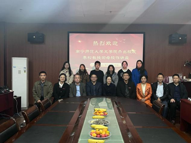 南宁师范大学庆祝建校七十周年华诞之际,2023年12月31日上午,文学院举办的“优秀校友回母校系列”座谈会,特别邀请文学院优秀校友2000级研究生、武汉大学文学院博士研究生导师李松教授在文学院会议室为师生作了题为《终极关怀、问题导向和批判自审——学术研究的哲学本体论》的学术讲座。文学院党委书记旷晓霞、院长石勇、副院长戚剑玲,文学院教师李志元、王俊博士、程志军,1999级研究生校友张军博士和文学院学生近60人参加讲座。讲座由文学院宾恩海教授主持。