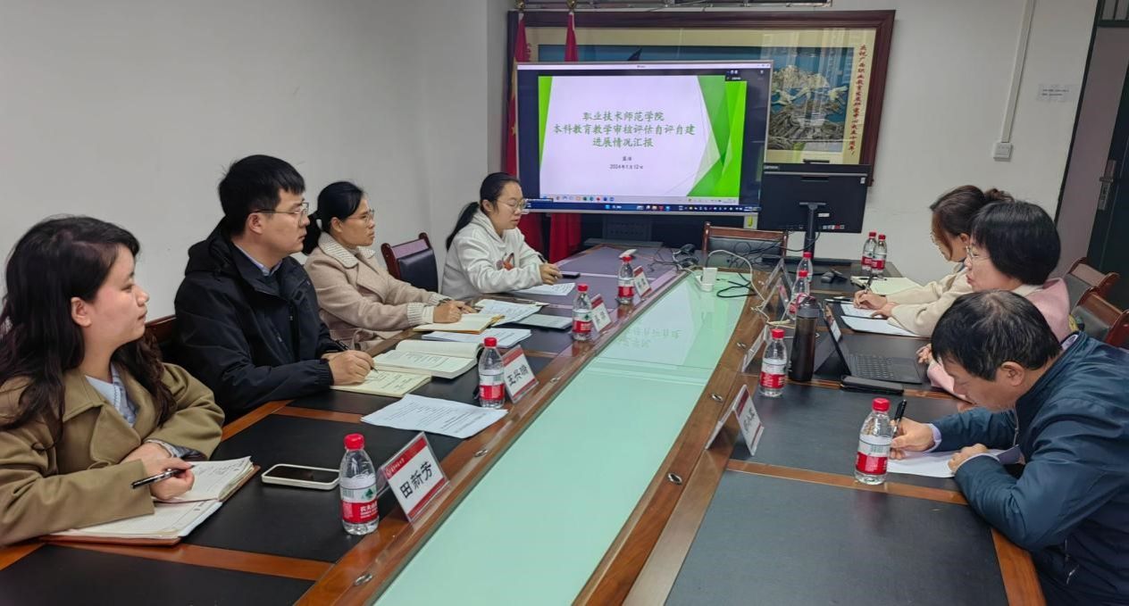 1月12日上午,教务处吴靖副处长一行7人到职业技术师范学院开展本科教育教学审核评估检查工作。职业技术师范学院分管教学副院长蓝洁、数字媒体技术教研室主任郑小军、职教师资公共课教研室主任邓朝霞、教学秘书邓玮琦参加会议。