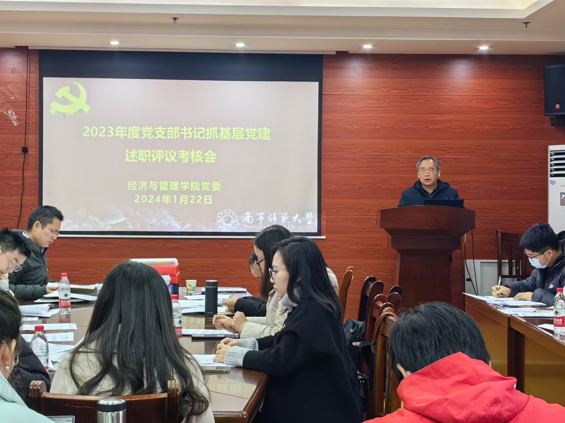 为进一步落实新时代党的建设总要求,不断提高学院党建工作水平,1月22日上午,经济与管理学院党委召开2023年度党支部书记抓基层党建工作述职评议会议,以评促建,推动全面从严治党向基层延伸。会议由党委书记纪明主持,经济与管理学院党委委员,各党支部书记,师生党员代表、师生群众代表参加了会议。