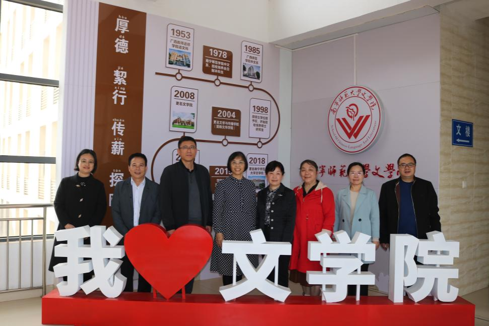 2024年1月17日,文学院85级校友代表闭健云、钟文、周敏一行回母校参观座谈。学校纪委书记李美清(文学院85级校友),校友办副主任韦天翼(文学院98级校友)及学院领导班子出席座谈会。