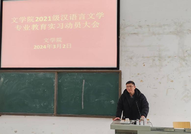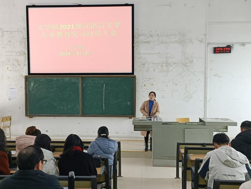为推进师范生教育实习工作的有序开展,增强师范生的教学综合实践能力,文学院于3月2日下午在五综308教室召开了2021级汉语言文学专业教育实习动员大会。本次会议由张煊光老师主持,文学院院长石勇、党委副书记李树玲、全体实习带队老师以及2020级汉语言文学专业全体本科生参加了会议。