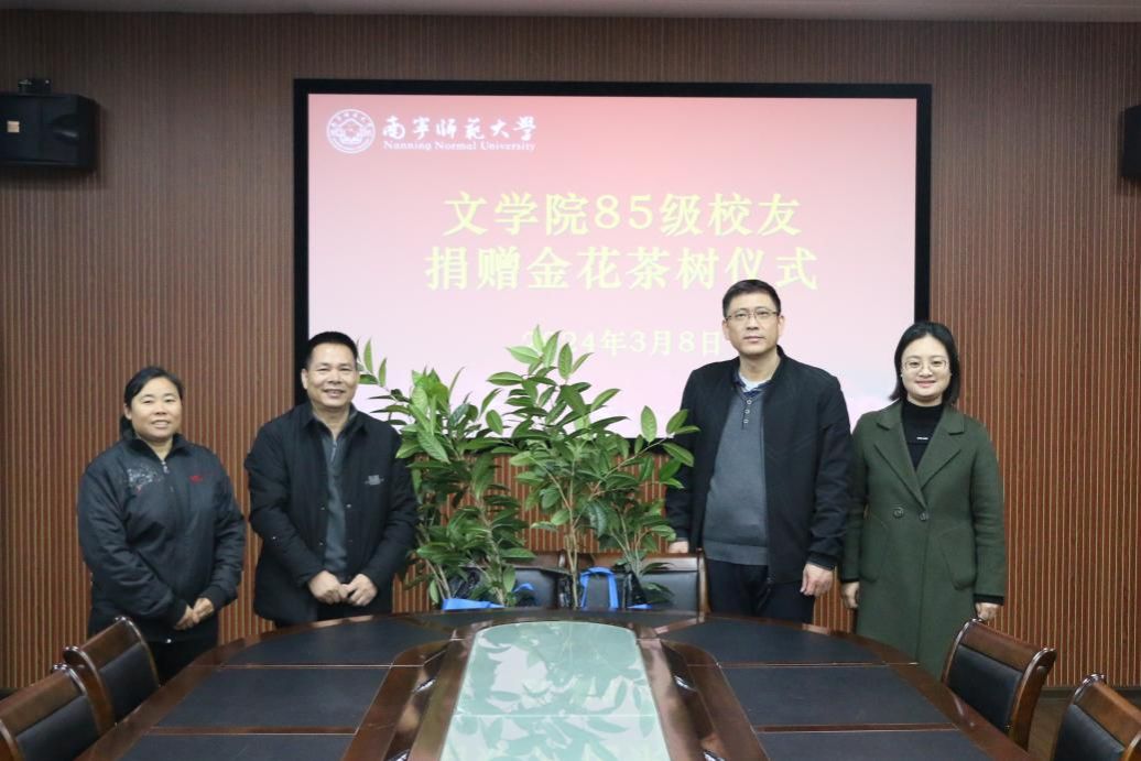 母校情深,教泽流芳。3月8日,在植树节来临之际,文学院85级校友闭健云为母校捐赠30多株金花茶树,文学院党委书记旷晓霞、院长石勇参加了捐赠仪式。