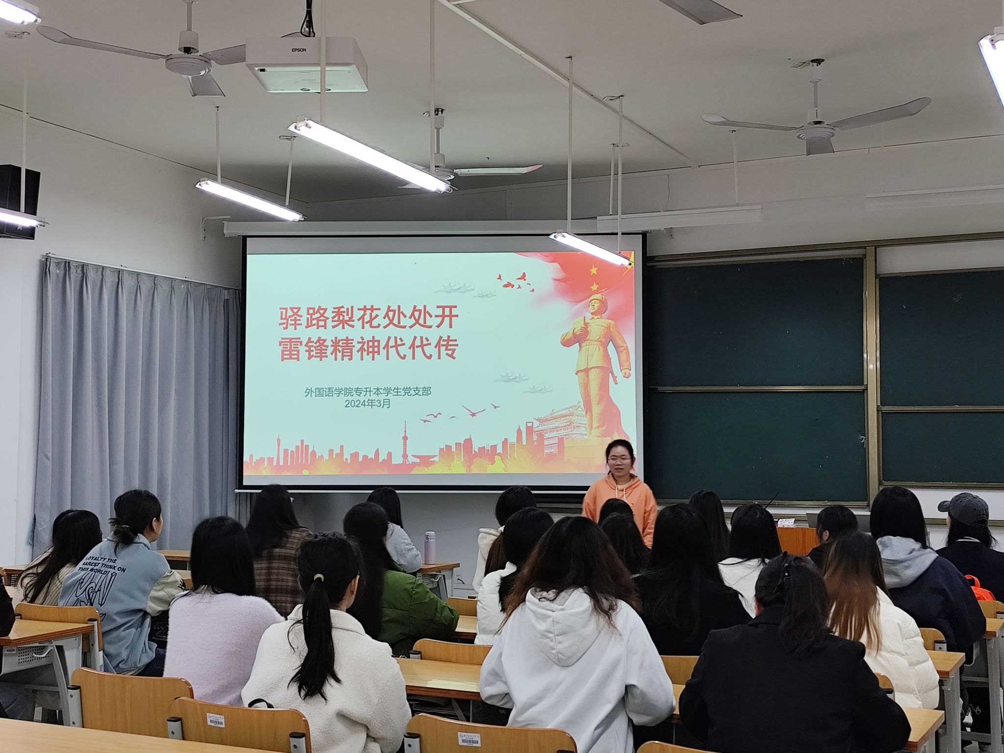 雷锋,不止是一个名字,更是一种精神,一座丰碑,感召一辈辈人不计小我,成就大我;激励了一代代人多行善举,不做恶行。为了深入学习和弘扬雷锋精神,教导大学生党员树立正确的价值观、人生观、世界观。外国语学院专升本学生党支部于2024年3月14日在校内2A-101教室对支部所辖管的班级开展以“驿路梨花处处开,雷锋精神代代传”为主题的宣讲活动。