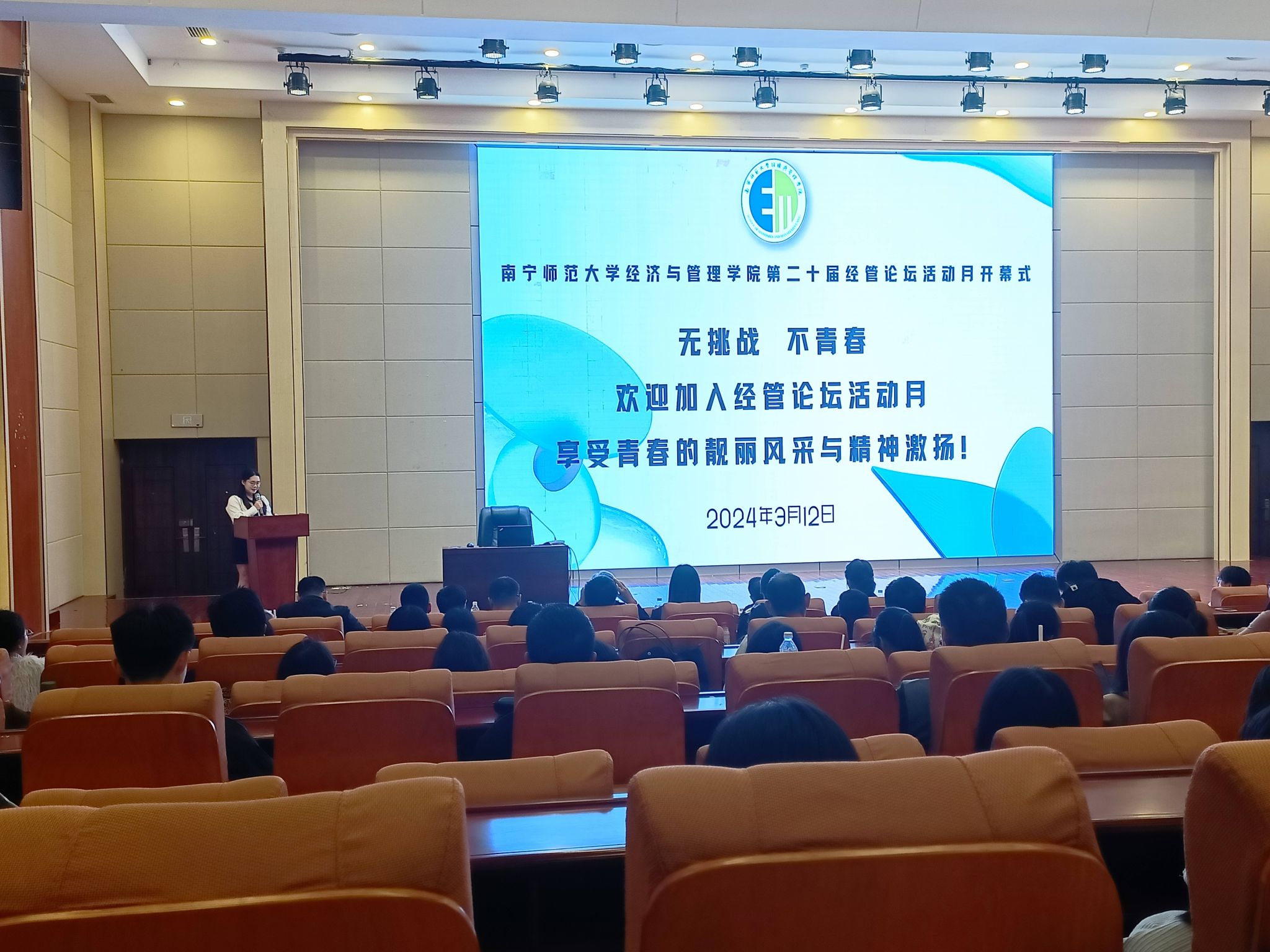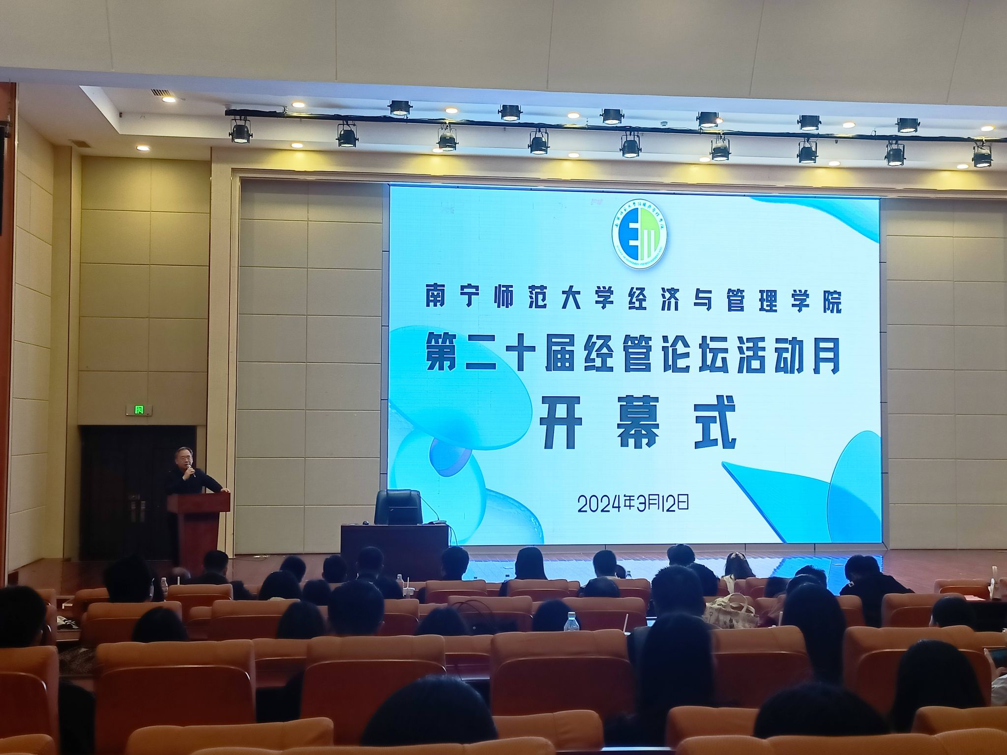为学习宣传贯彻党的二十大精神,不断丰富大学生专业知识积累,着力锻炼大学生理论与实践相结合能力,持续打造具有经管特色的靓丽活动名片,3月12日下午,经济与管理学院于文综楼114教室举办了第二十届经管论坛活动月开幕式,学院党政领导、教师代表、学生代表参加了活动。学院韦海鸣院长代表学院致开幕词。韦院长介绍了经管论坛活动月二十年的发展历程,介绍了“我与MPA面对面”大讲堂、营销策划大赛、社会问题调查设计大赛、文化创意大赛、模拟竞聘大赛、商务精英挑战赛和经管论坛活动月闭幕式暨毕业生晚会等主要活动安排,鼓励同学们踊跃参与到各项活动比赛中去。韦院长指出,希望同学们能够积极参赛,以赛促学、以赛促进,学以致用,有所成长。在全程热烈的掌声中,韦院长宣布第二十届经管论坛活动月正式开幕。