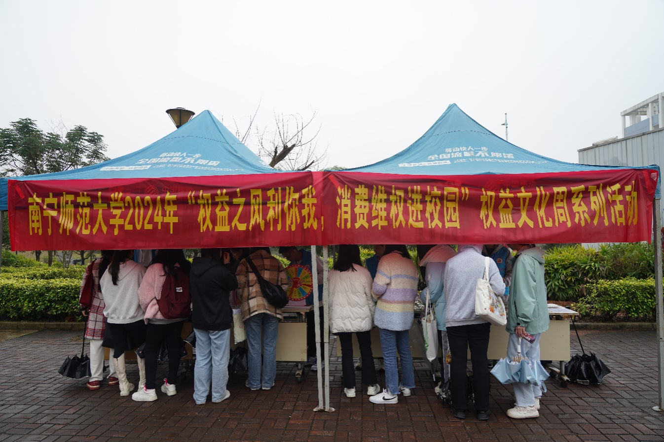 为营造良好校园氛围,增强同学们的维权意识,提高同学们的维权能力,推动校园精神文明建设。3月15日,我校分别在明秀、五合、武鸣三个校区开展了2024年“权益之风利你我,消费维权进校园”权益文化周系列活动,共吸引近千名同学积极参与。