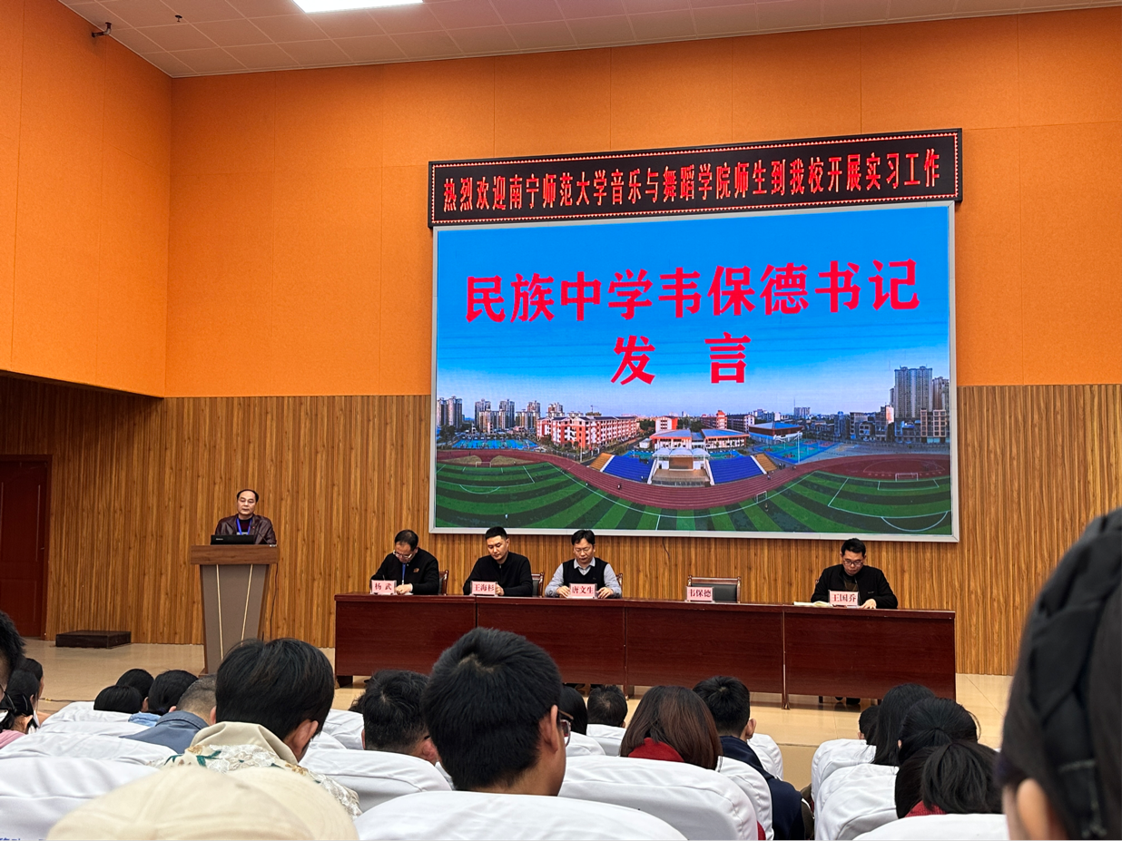 2024年3月11日下午,音乐与舞蹈学院院长助理唐文生、教研部主任王海杉带领2020级音乐学专业学生赴武鸣区民族中学进行教育实习,实习见面会在武鸣区民族中学报告厅举行。