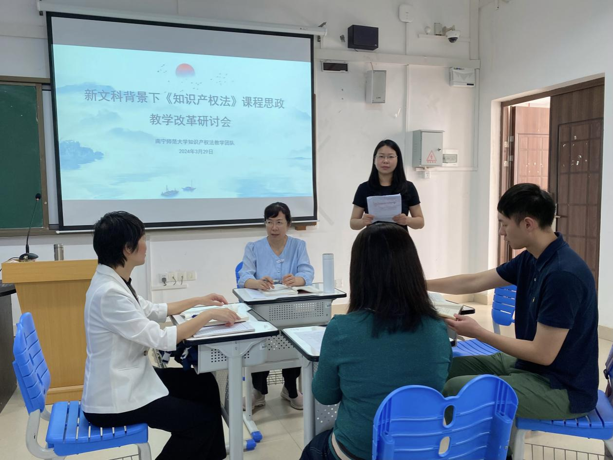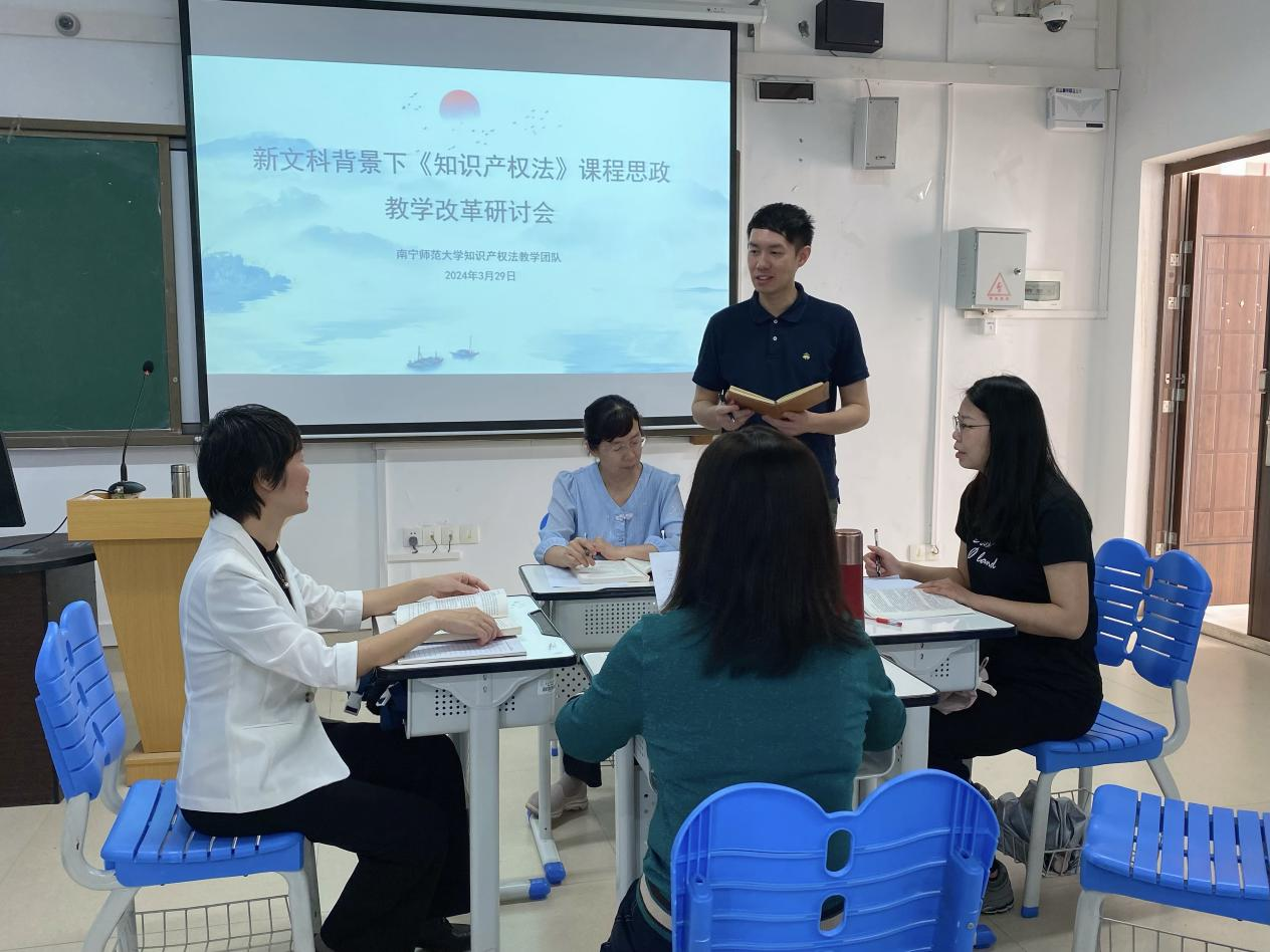 邱俞捷副教授从“内容供给”的角度出发,提出要切实提升课程思政的育人作用,重点在于推动法学知识与思政内涵的有机融合。将课程思政教育的“供给”与法科学生的“需求”相契合,并具体从教育者、受教育者、教育内容和教育载体四个方面进行了经验分享。参会老师针对课程思政建设的若干问题,与知识产权法教学团队成员展开了热烈探讨,积极探索了体现南宁师范大学办学特色和资源优势的课程思政建设路径。