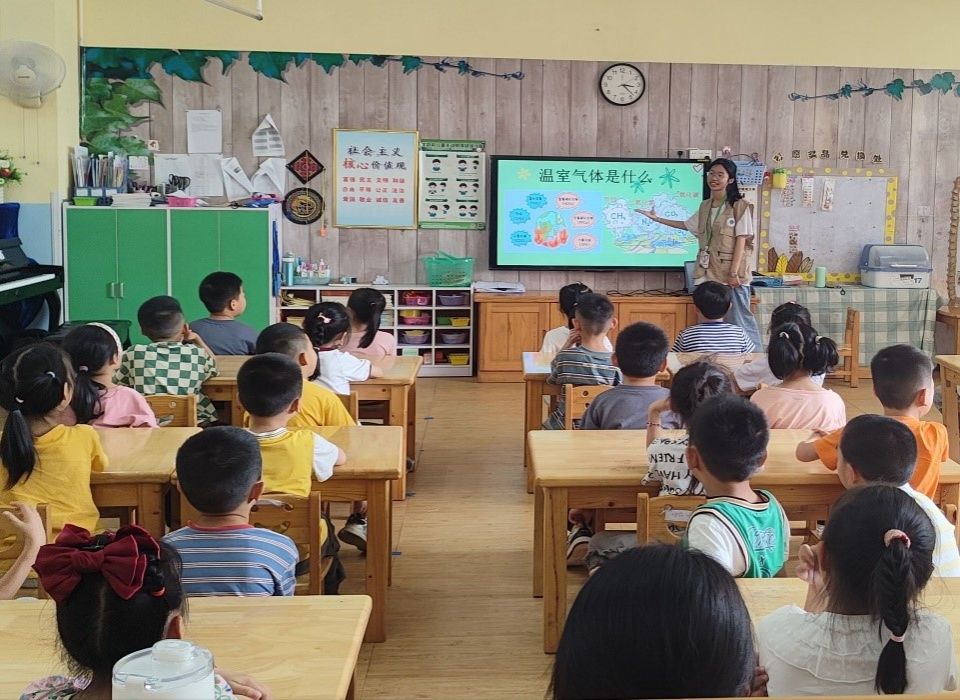 活动伊始,支教部志愿者和支教队员们带着充沛的热情和丰富的知识走进各班教室。随后,支教队员带领中班的小朋友们一起探讨“春天的秘密”,观赏春天的景象,了解春天大自然变化的原因等。与此同时,大班的小朋友们也正认真听着主题为“地球爷爷发烧了——温室效应”的知识小课堂,不仅认识到了温室效应的产生和影响,同时也学习到了如何减少碳排放,保护地球环境。课堂上,小朋友们踊跃发言,积极参与其中。