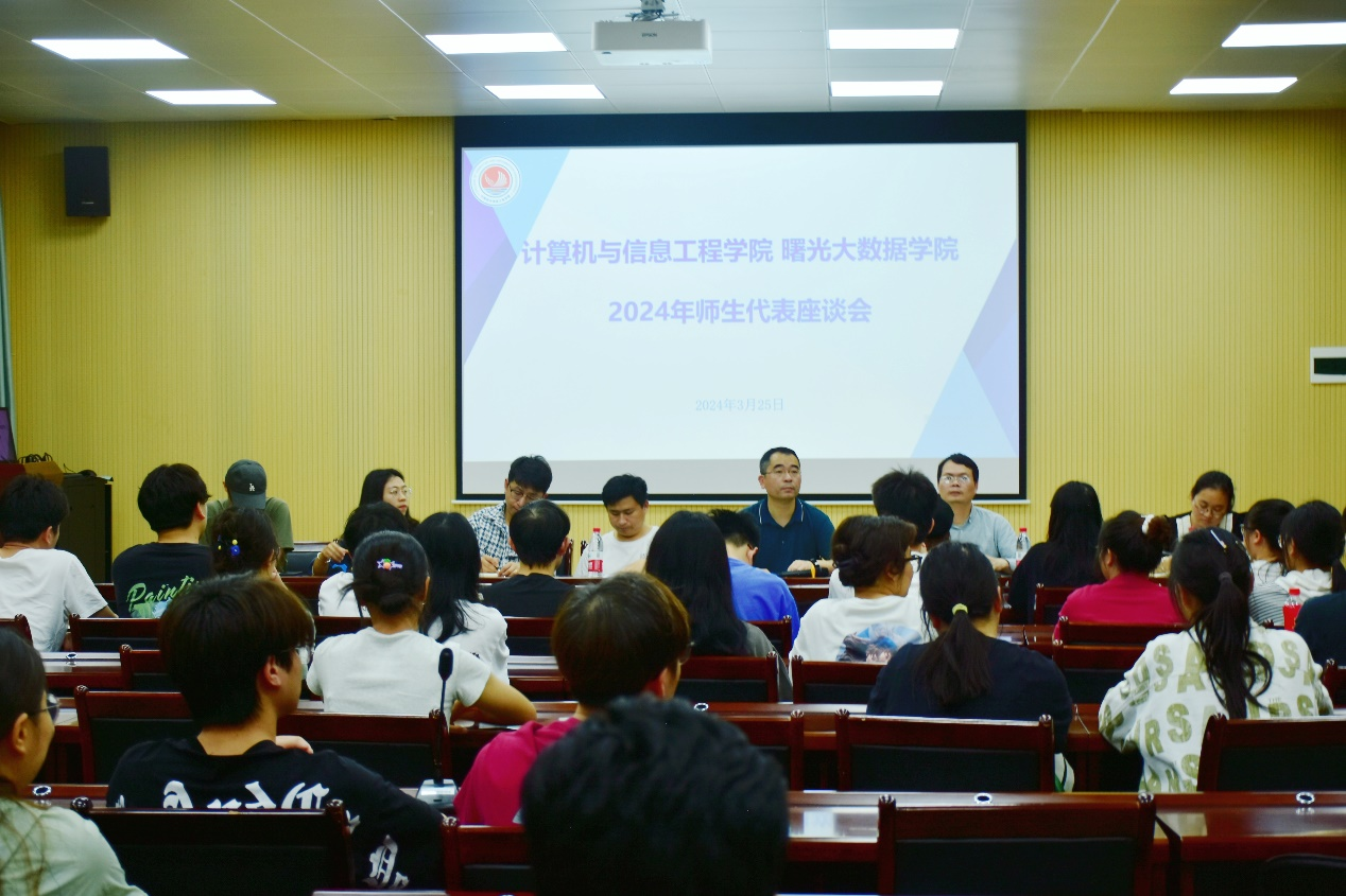 为深入调研学院课堂教学情况,全面了解学生的意见和需求,畅通师生沟通渠道和建立反馈机制,推动教风学风建设。计算机与信息工程学院/曙光大数据学院于3月25日在地信楼A301召开了2023-2024学年第二学期初师生代表座谈会。分管本科教学工作的熊冬春副院长、教育技术学系主任吴兰岸博士、23数据2班班主任李林博士、辅导员宋宏斌、林雪、史朝有、许艺静以及43名学生代表参加。