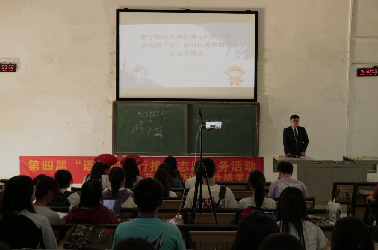 开幕式伊始,谭李丹同学回顾了往届“语”你同行志愿服务的活动成果,并介绍本届活动的主要安排。今年的“语”你同行活动将采取线上线下同步授课的方式,开展“字正腔圆”普通话技巧培训、“能说会道”主持技巧培训、“经典诵读”朗诵比赛、“多彩乡音”方言交流、“大手拉小手,学好普通话”培训。此外,本次活动将广西特色民族文化和语言文化融入培训课程,在帮助提高同学们普通话水平的同时促进民族团结和语言文化交流。