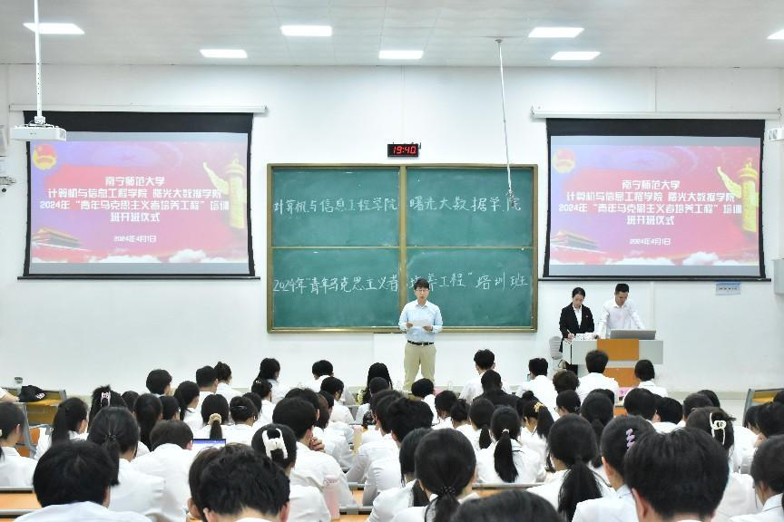 为深入学习和贯彻习近平新时代中国特色社会主义思想,坚定青年一代听党话、跟党走的信念。计算机与信息工程学院/曙光大数据学院于4月1日在地化楼B111教室举行“青年马克思主义者培养工程”(以下简称“青马班”)培训班开班仪式暨第一讲。此次培训由辅导员宋宏斌老师主讲,辅导员许艺静老师和计算机与信息工程学院/曙光大数据学院“青马班”全体学员参加。