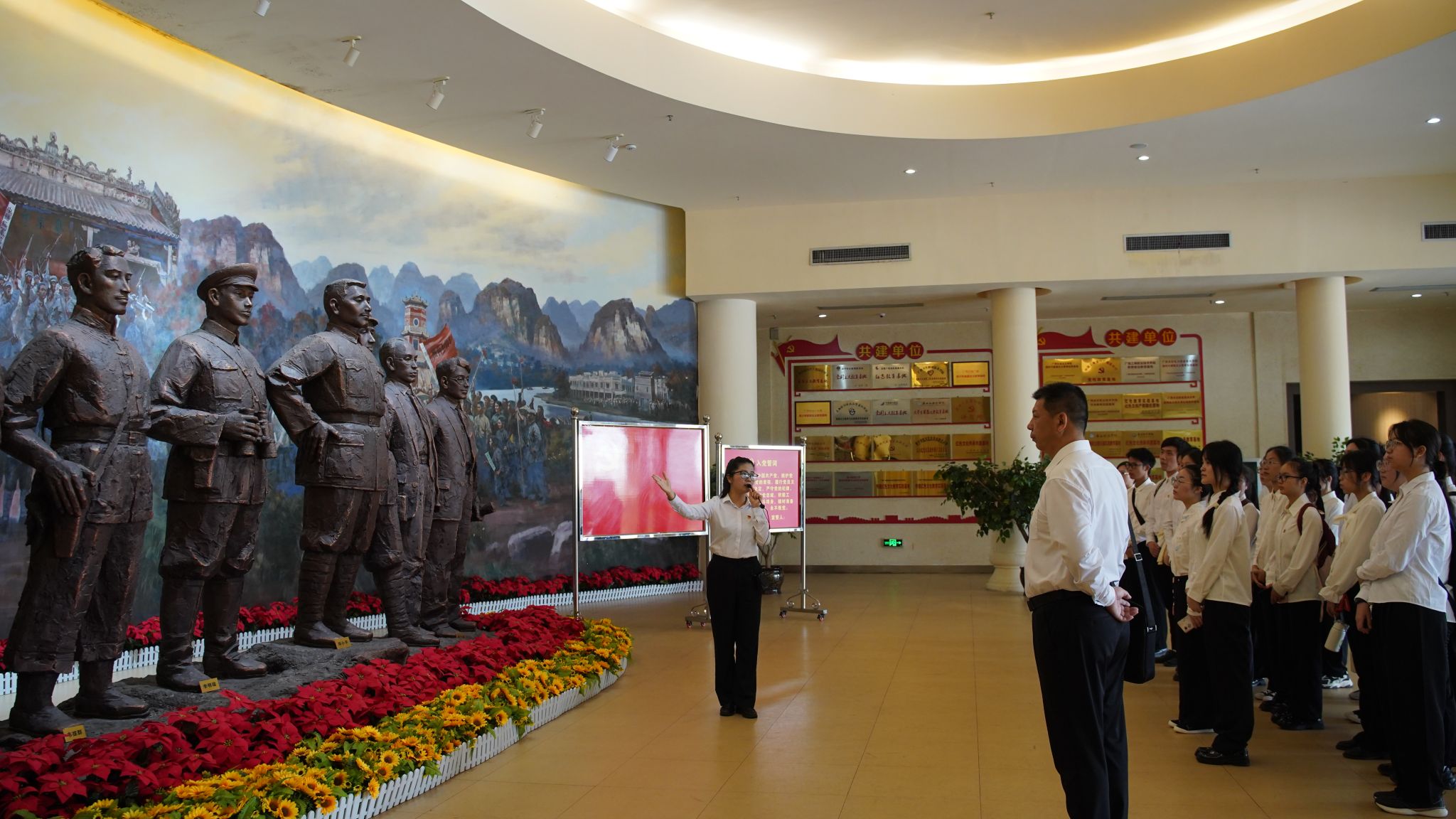 思政课实践教研室主任刘艳闽、班主任侯一夫副教授带领同学们开展了此次活动。活动伊始,革命纪念馆,活动伊始,在庄严的国歌声中,全体人员肃立,向烈士纪念碑敬献鲜花,以表达对烈士们的崇高敬意和深切缅怀之情。随后,在讲解员的细致引导下,全体师生逐一参观了新民主主义革命、土地革命、抗日战争、解放战争四个时期的广西革命史展厅。在讲解员生动的解说下,大家仿佛穿越历史长河,感受了广西军民在中国共产党的领导下,英勇奋战、不畏牺牲的壮丽历史画卷。