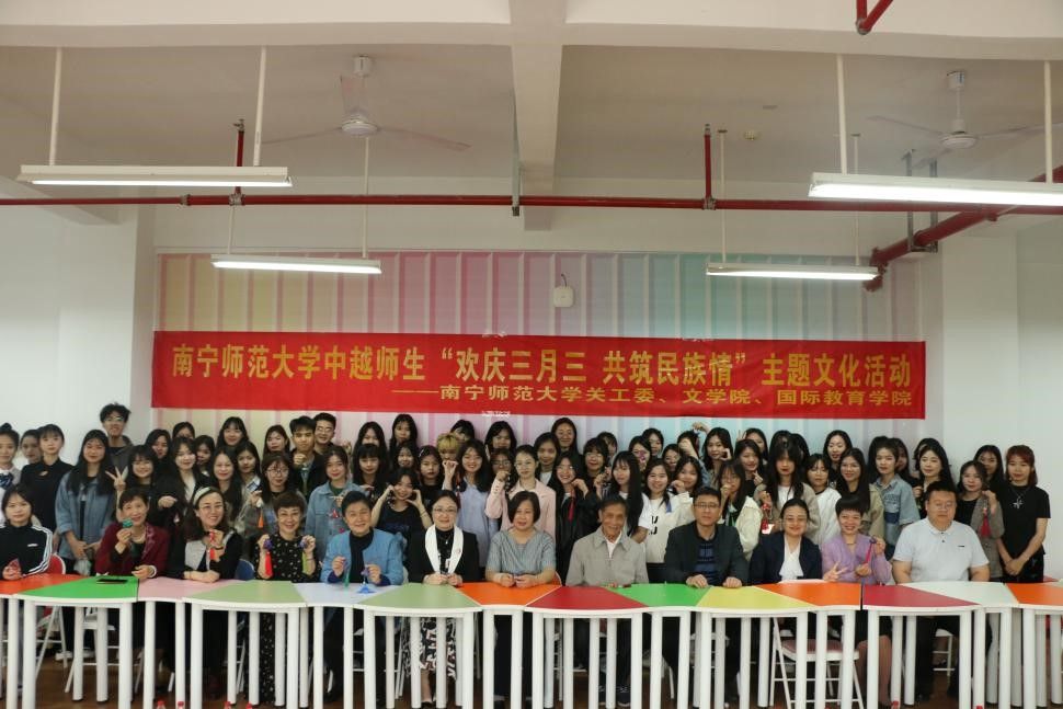 4月9日上午,由校关工委主办、文学院承办、国际教育学院协办的中越师生“欢庆三月三,共筑民族情”主题文化活动在研究生综合楼202顺利开展。学校关工委常务副主任、原广西师范学院副院长王甲辉、离退休党委书记、关工委副主任周泉、文学院党委书记旷晓霞、国际教育学院党委书记黄菊、文学院院长石勇等领导班子,学校关工委老师及文学院学生代表、越南留学生参加了本次活动。