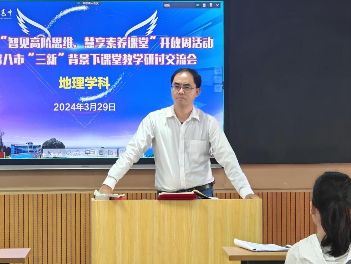 点评交流环节,多名课程教师与在座观摩学生从教学学情、过程和效果等几个方面,对分享环节的展示课程进行点评并展开交流。张胜前教授认为,上述所展示的课程体现教学的课标意识、资源意识、主体意识和评价意识,很好的完成相关教学设计和学生学习引导。并向课程教师提出在大单元教学的设计、学生知识的自主建构、教学资料的更新完善、学生家国情怀和国际视野培养等多方面的建议。他借此提出希望,一是我院观摩学生要认真观摩本次研讨视频,并从同课异构的视角,对课例进行分析。二是希望武鸣高中和其他区内外学校能以教育部地理科学专业虚拟教研室平台为载体,继续开展类似地理教研活动,从而不断提高课堂教学质量。